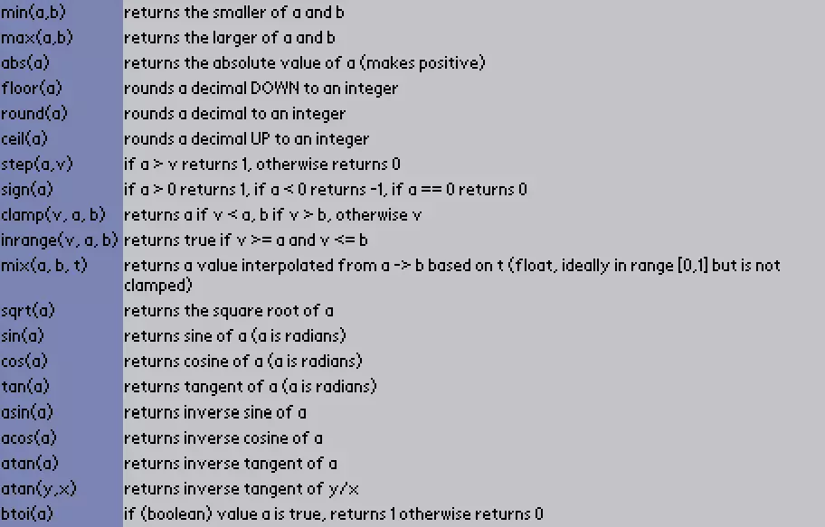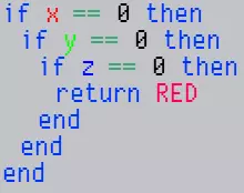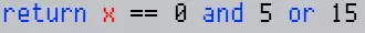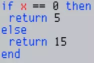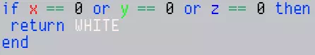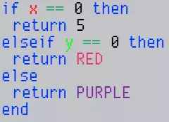 你的代码不必返回0。不返回任何内容将被视为0(空白)。 返回布尔值时,false会显示空白,true会显示颜色1(白色)。 Lua没有内置的三元运算符,但你可以利用其条件评估方式来模拟。一种常用的缩减代码量的技巧是将如下代码: