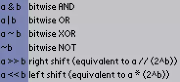 Lua也支持按位运算符,这些运算符会对所涉及数字的各个位进行二进制操作(如果你不知道这是什么,可以去查阅相关资料)