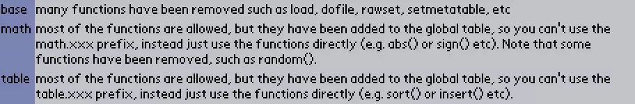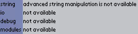 高级主题 游戏使用Lua语言,但你的代码将在“沙盒”环境中运行。 仅加载以下Lua库: