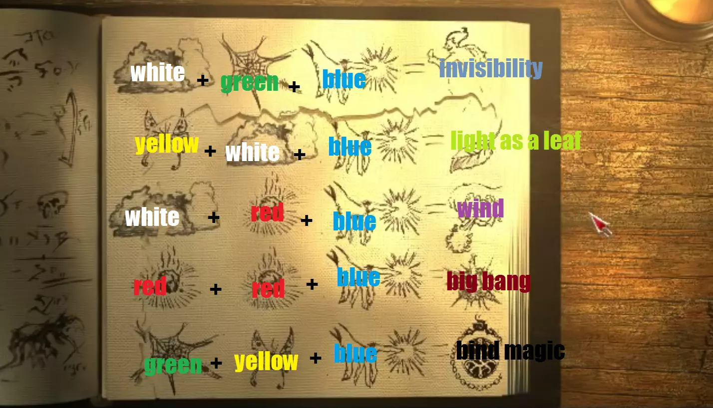 前往坩埚处。 魔法词典里只有一个配方,我们来制作它。 按顺序将白色、绿色、蓝色药剂瓶放在坩埚上,制作隐形药水。 这种药水有助于从迷宫中收集羊皮纸。 对艾普丽尔使用隐形药水,去取羊皮纸,之后返回。 将羊皮纸放在词典上,阅读另外4个配方。 前往坩埚处。 使用黄色、白色、蓝色药剂瓶,制作轻如鸿毛药水。 现在前往书房的窗户,向左查看架子上方,那里有红色精华。 对艾普丽尔使用轻如鸿毛药水,跳起来获取它。 检查红色药剂可知:红色=热煤 回到坩埚处。 使用白色、红色、蓝色药剂瓶制作风之药水。 使用红色、红色、蓝色药剂瓶制作大爆炸药水。使用绿色+黄色+蓝色制作【束缚魔法】药剂。 前往桌上的水晶,对其使用【束缚魔法】和【大爆炸】药剂。 打开窗户,用你的【长笛】召唤乌鸦。 对乌鸦使用【风之】药剂。 带上乌鸦,将其用于窗户。 码头: 与内贝瓦伊船长交谈,并向他展示【风之】药剂。 你需要一名领航员,前往旅人客栈。 客栈: 将【地图】交给蓝皮肤女子。 告诉她工作机会。 前往市集的地图商人处。 前往神庙。 神庙: 与托拜厄斯交谈(他在后面),并获得【平衡护符】。 前往码头,与内贝瓦伊交谈,启航前往第六章! 第六章 - 混沌风暴 从船左侧(你的右侧)的桶里拿一个【苹果】。你可以上去和人们交谈,查看魔法罗盘。 下去下面。 那里有一个麻袋,用粘性糖果(STICKY CANDY)对着它使用。(你会得到一个糖果包装纸(CANDY WRAPPER)) 拿起虫子(WORM)。 在你的物品栏里将虫子和苹果(APPLE)组合。 现在回到上面,前往船长舰桥。 把被入侵的苹果(invaded APPLE)交给船长。 让领航员掌舵。 用护身符(TALISMAN)对着魔法罗盘使用。 当领航员回来时,告诉她修正航线。 拿回你的护身符,然后再次下去下面。 查看右边的箱子。 在对面拿起斧头(AXE),并用它劈箱子。 哦豁(OUPS),进入第7章! 第7章——深蓝之镜 试着抚摸从水里探出来的头。 海底: 查看那些图画。 拿起墙上的蓝色珊瑚虫(blue polyp),并对艾波儿(April)使用。跳进地板中央的深坑。 外面有一个贝壳,从里面取出黑珍珠。 游到后方的城市。 尝试和美人鱼对话。 拿走墙上的黑色水晶。 查看并从左边墙上取一些绿色物质。 回到有空气的地方。 用图钉刺艾普丽尔,获取一些血液。 将血液和绿色物质混合,再把这个混合物与黑珍珠结合。 你得到了金珍珠,将其用在艾普丽尔身上。 现在可以和美人鱼对话了,返回城市并与她交谈。 向她展示黑色水晶。 游出城市,搜索左边的海藻,你会找到红色水晶。 进入显现的洞穴,再收集两颗水晶——黄色和绿色。 现在查看祭坛。下方图片展示了谜题解开后的样子——所有物品都已归位。你必须将【水晶】放置在正确位置,确保水晶侧面的符号与祭坛上的相同符号相对应。