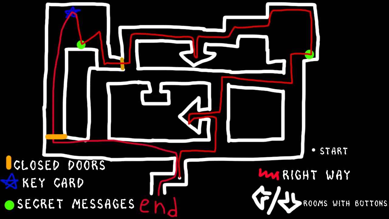 你的任务是通过有一个看起来像SCP-106的怪物的区域。除非你奔跑,否则怪物听不见你。按下带有白色三角形的两个按钮,然后前往之前关闭的门,按下第三个按钮。之后你就可以安全地离开有怪物的区域。 ◉-◉-◉-◉-◉-◉-◉-◉-◉-◉-◉-◉-◉-◉-◉-◉-◉-◉-◉ 区域地图以及获取钥匙卡的路径。