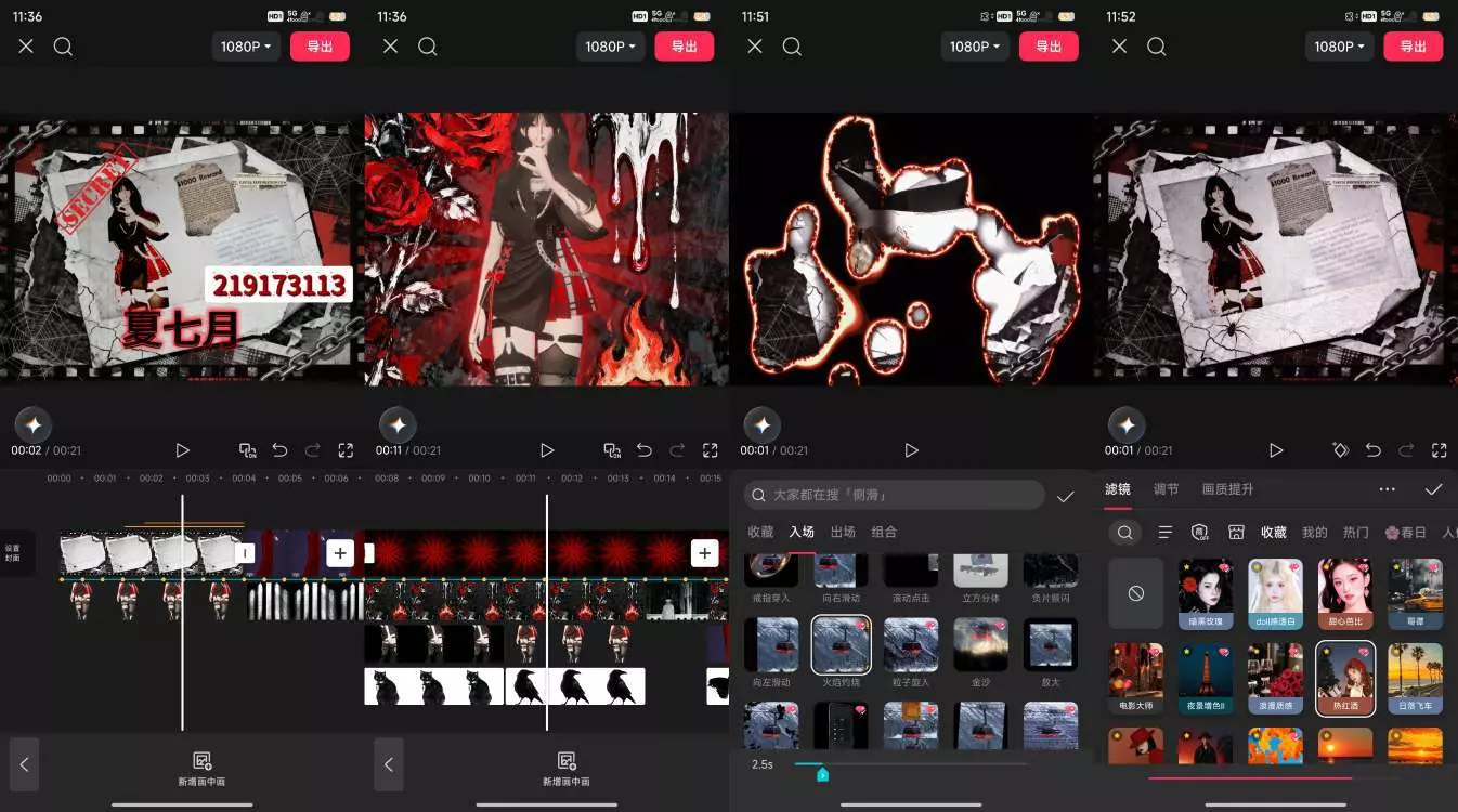 这是创作月榜相关的暗黑风格视频创作展示,视频以“别幻想用流言蜚语来摧毁我”为主题,呈现了夏七月相关的暗黑系视觉内容,还展示了视频剪辑时的滤镜、转场等操作界面。