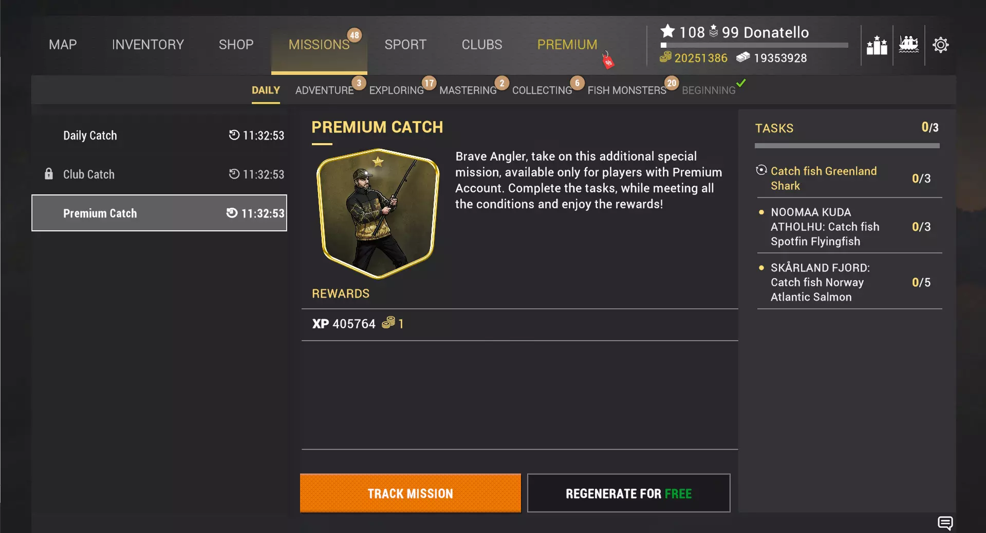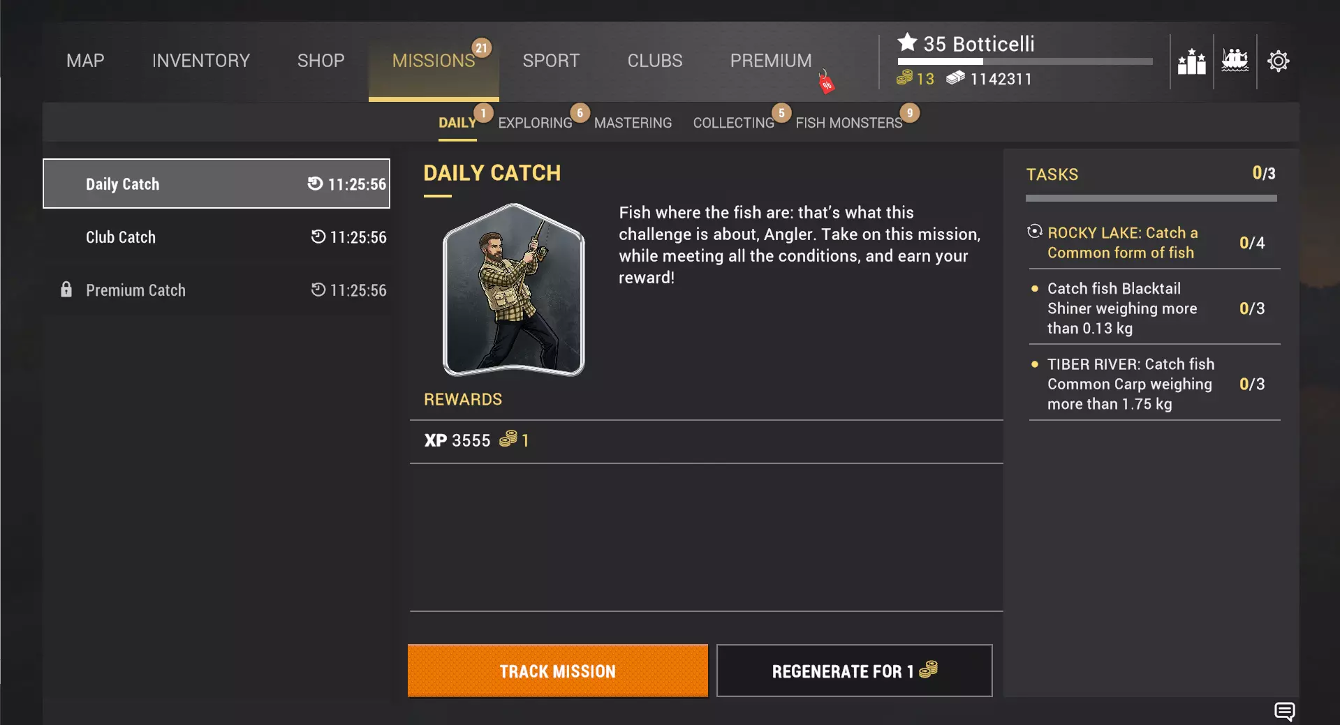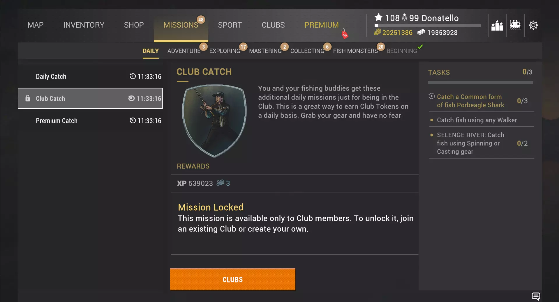 这些筛选器会在你重启游戏或前往其他水域时重置,就像目前的机制一样。 虽然乍一看很简单,但我们希望浮标着色能成为一个小小的补充,为你的钓鱼体验带来不错的生活品质提升。作为额外福利,此次更新还将标记浮标的上限从2000个增加到2500个,我们知道钓鱼爱好者们一直期待着这一改动。 每日任务 在开发此功能时,我们专注于几个关键目标:为玩家提供值得期待的日常活动,增加钓鱼体验的多样性,以及最重要的是,创造新的、稳定的获取鱼饵币和俱乐部代币的途径。 每日任务是一组限时任务,每天刷新,为你提供可完成的目标和可获取的奖励。每天,系统会根据你的当前等级和活跃度生成最多三个任务:日常捕捞——所有玩家均可参与;俱乐部捕捞——俱乐部成员可参与;高级捕捞——拥有活跃高级账户的玩家可参与。