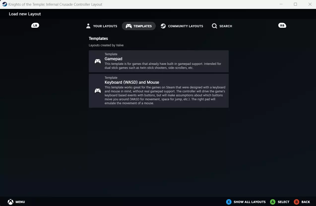 如果不是,请点击它,在打开的菜单中进入【模板】选项卡,从列表中选择【键盘(WASD)和鼠标】。这将使配置器显示相应的模板。只需选择屏幕底部的【应用布局】即可使用。我们很快会对这些进行更改,所以不必担心按键绑定问题。 如果选择【社区布局】,你也可以在其中找到我分享的名为【Preset Keyboard Emulation】的预设。只需点击它进行下载并查看绑定,然后选择屏幕底部的【应用布局】即可使用。现在你可以安全地关闭窗口,或者开始根据自己的喜好编辑按键。我已根据游戏主机版的按键设置来配置按键,同时在必要时采用现代游戏控制绑定(例如将攻击绑定到X和Y键),以提升操作体验的舒适度。不过这也导致部分按键设置看起来有些怪异,比如确认键为A键,返回键为Start键。 请注意,每款手柄的设计都有所不同,我预设的配置可能无法适配所有手柄,从而出现按键错乱的情况。这种情况下,你需要按照以下其余说明手动配置你的手柄。