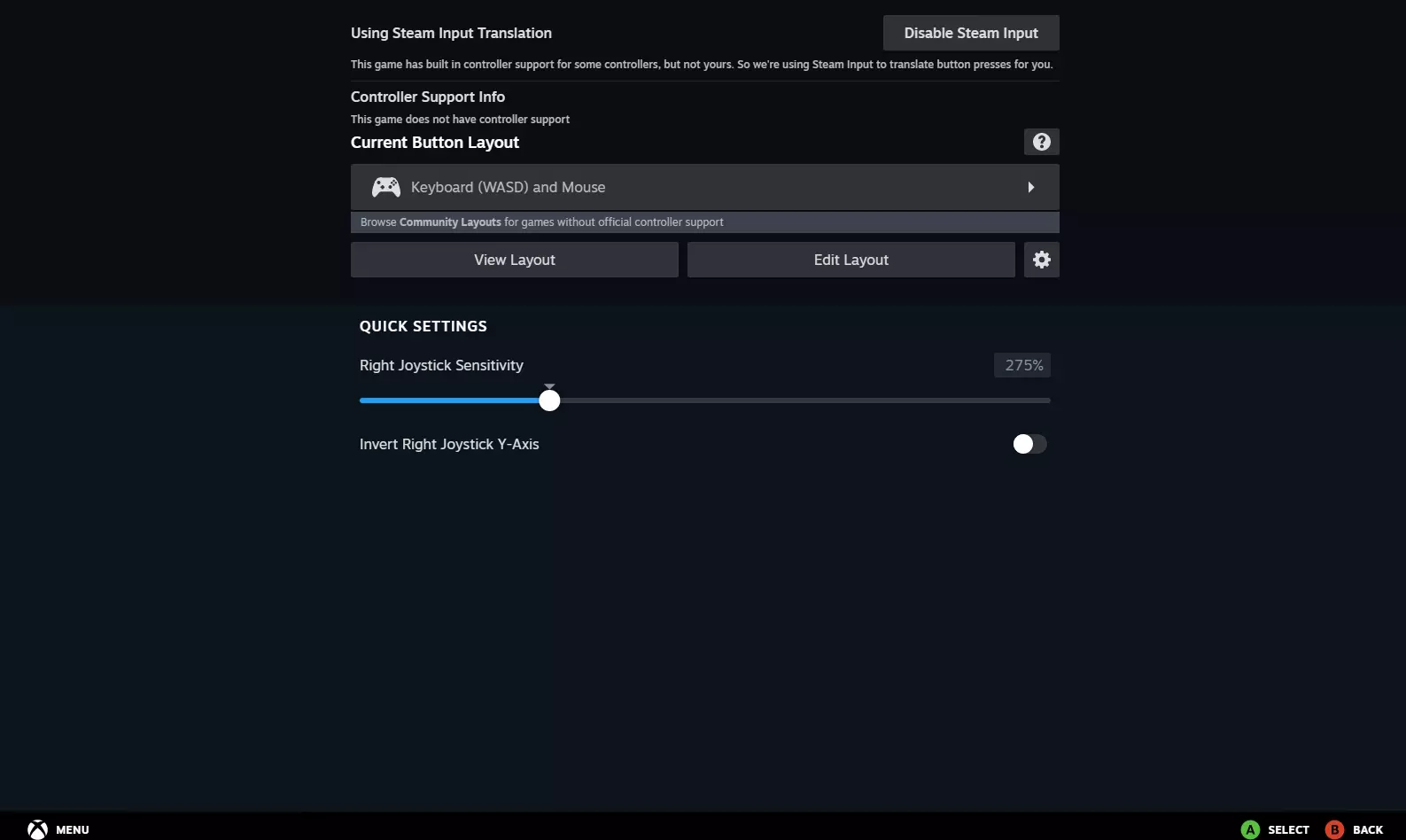 请确保取消勾选DirectX选项卡中的两个选项。仅取消勾选其中一个会导致游戏窗口没有标题栏,并锁定在屏幕右上角,无法拖动到其他位置。 另外请注意,启动游戏或更改分辨率后,标题栏会延迟显示。此现象属于正常情况。 可选操作:通过Steam输入功能启用控制器 尽管《圣殿骑士:地狱十字军》也在主机平台发行,但其PC版本不支持控制器。不过,你可以借助Steam的一项非常实用的功能轻松启用控制器支持,即Steam Input API(简称SIAPI)。借助SIAPI,你可以为不支持控制器的游戏激活控制器支持,或者让游戏能够识别你不受支持的第三方控制器的输入。在这里,我们将使用SIAPI的键盘鼠标模拟功能,把你控制器上的按键操作转换为键盘指令并传递给游戏。 别担心,这个过程相当简单。不过,如果你不想自己动手调整,我也在下方附上了我个人基于Xbox 360控制器的配置文件。 以下是手动配置控制器的方法: 1. 连接你的控制器 2. 打开Steam上的游戏属性菜单然后选择控制器菜单并点击控制器配置器。或者,你可以点击游戏客户端页面上的齿轮图标,然后选择管理并点击控制器布局。之后会打开此窗口,点击启用Steam输入。