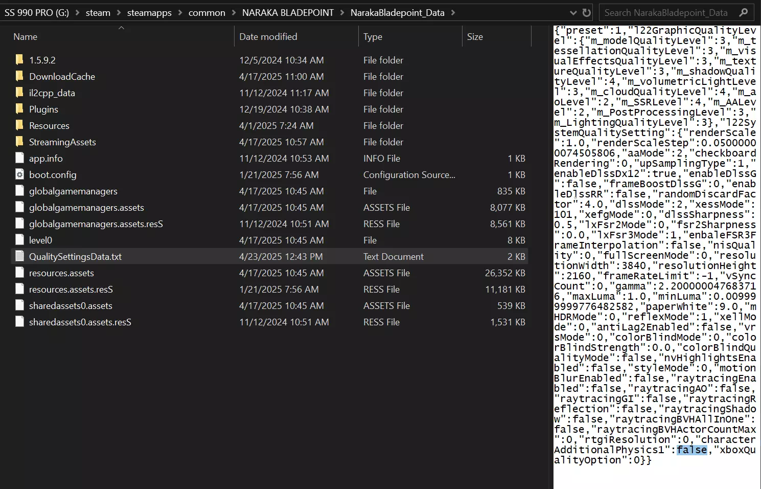 保存文件并启动游戏。享受游戏中更流畅的物理效果! Epic Game版本: 执行相同步骤——找到QualitySettingsData.txt文件并按上述方法编辑。路径:X: Epic Games NARAKA BLADEPOINT NarakaBladepoint_Data QualitySettingsData.txt(将X:替换为你的Steam安装盘符,通常为C:或D:) Xbox Games版本: Xbox PC版可能不包含QualitySettingsData.txt文件。 你可以使用以下代码手动创建该文件,并将其放置在NarakaBladepoint_Data文件夹中。{"预设":1,"l22图像质量等级":{"模型质量等级":3," tessellation质量等级":3,"视觉效果质量等级":3,"纹理质量等级":3,"阴影质量等级":4,"体积光等级":3,"云质量等级":4,"环境光遮蔽等级":2,"屏幕空间反射等级":4,"抗锯齿等级":2,"后期处理等级":3,"光照质量等级":3},"l22系统质量设置":{"渲染缩放":1.0,"渲染缩放步长":0.05000000074505806,"抗锯齿模式":2,"棋盘格渲染":0,"上采样类型":1,"启用Dx12版深度学习超级采样":true,"启用G版深度学习超级采样":false,"G版深度学习超级采样帧率提升":0,"启用深度学习超级采样反射":false,"随机丢弃因子":4.0,"深度学习超级采样模式":2,"Xe超级采样模式":101,"Xe帧生成模式":0,"深度学习超级采样锐度":0.5,"lxFsr2模式":0,"fsr2锐度":0.0,"lxFsr3模式":1,"启用FSR3帧生成":false,"nis质量":0,"全屏模式":0,"分辨率宽度":3840,"分辨率高度":2160,"帧率限制":-1,"垂直同步计数":0,"伽马值":2.200000047683716,"最大亮度":1.0,"最小亮度":0.009999999776482582,"纸白亮度":9.0,"mHDR模式":0,"reflex模式":1,"xell模式":0,"antiLag2启用":false,"vrs模式":0,"色盲模式":0,"色盲强度":0. 这样会被封号吗? 我已经用了大约一年,没有收到过封号。 这是大多数网易游戏都存在的功能(你甚至可以在《永劫无间》移动版中看到它处于启用状态)。由于某些规定,PC端可能将其禁用了。他们没有完全移除该功能,只是为了遵守规定而将其关闭。启用它有副作用吗? 是的——启用后会增加更多基于物理的移动,这可能会影响帧率。不过,如果你的电脑性能足够强大,性能下降会非常轻微。由于需要处理更多的角色动作,游戏在战斗过程中可能会处理更多任务。