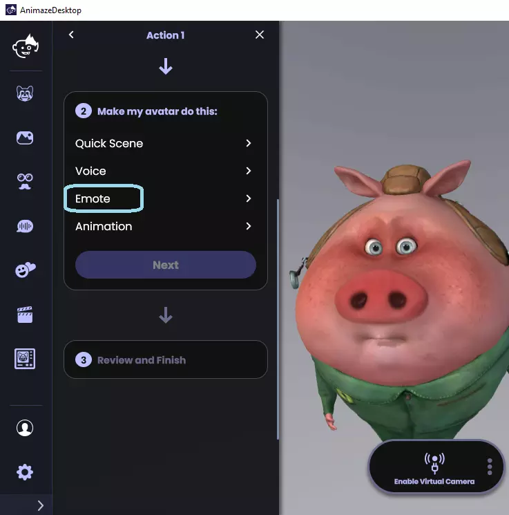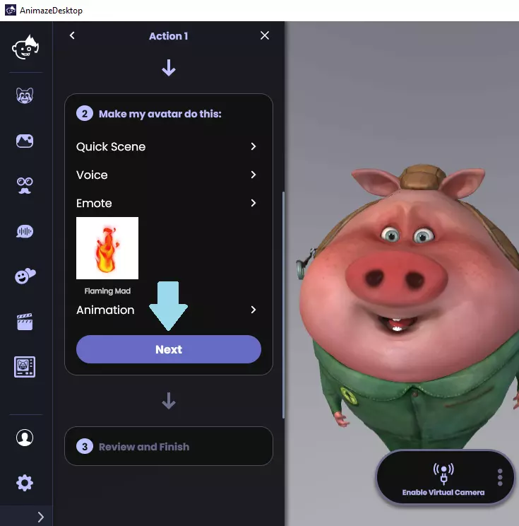 9. 点击下一步,然后选择当聊天中出现该词语时虚拟形象的动作。快速场景(更改快速场景)、声音(应用声音效果)、表情动作(播放表情动作)、动画(播放相应动画) 10. 在本常见问题中,我们选择了表情动作