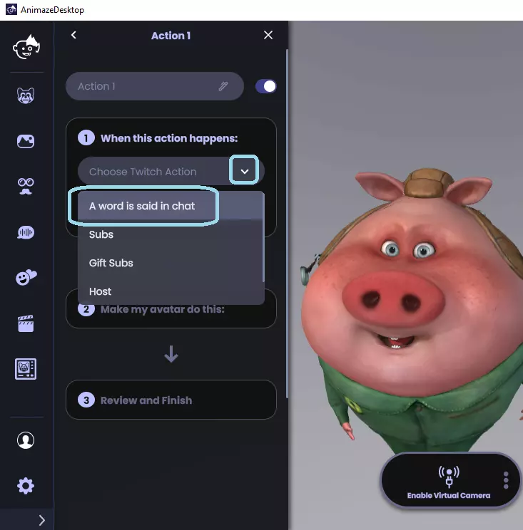 5. 点击箭头以显示选项下拉列表,然后选择一个选项来触发虚拟形象的动作:聊天中提到的词语、订阅、礼物订阅、主持或突袭 6. 在本常见问题中,我们选择了聊天中的“提到某个词语”