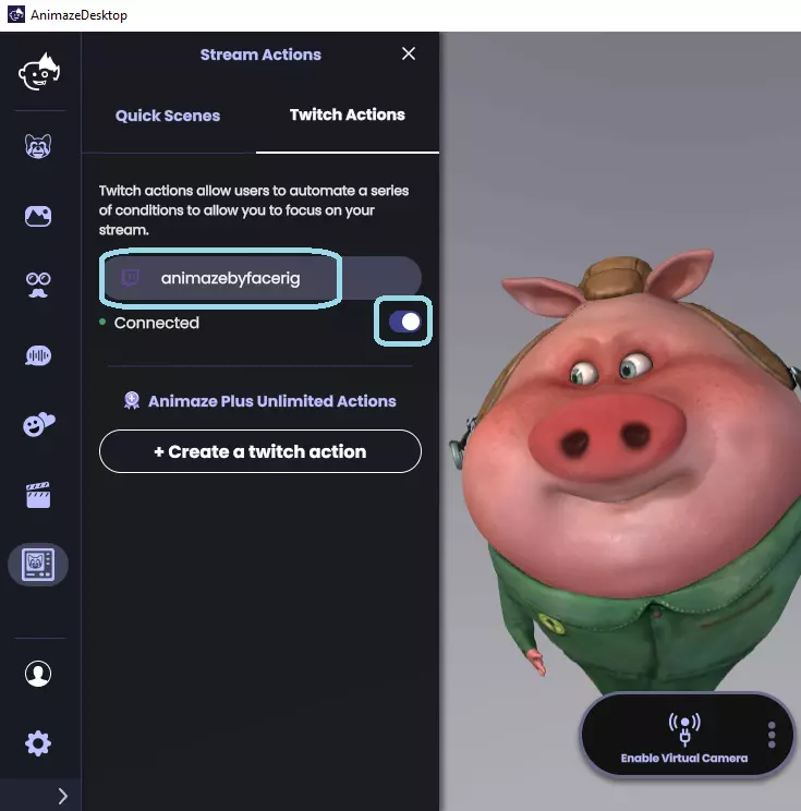 本指南将介绍《Animaze》的Twitch集成功能以及如何设置Twitch动作。 如何创建和使用Twitch动作 借助《Animaze》的Twitch集成功能,你可以设置虚拟形象在以下情况时做出反应:当观众在聊天中输入特定词语、订阅、赠送订阅,或当你进行主机模式或 raids 时,虚拟形象可以做出表情或动画、切换场景或使用语音效果。 1. 点击快速场景图标以打开流动作抽屉菜单 2. 点击Twitch动作