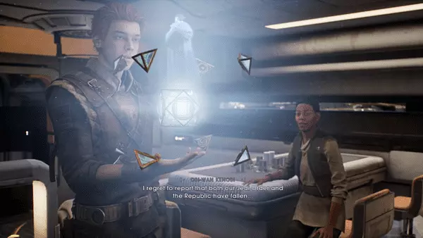 《星球大战:绝地:陨落的武士团™》相关剧情:来自《星球大战:义军崛起》系列的欧比-旺的留言。在卡尔与塞拉、格里兹前往博加诺星球,并发现埃诺·科尔多瓦将原力敏感儿童的位置藏匿于整个银河系后,塞拉让卡尔打开了全息记录仪。玩过《星球大战 绝地:陨落的武士团》的玩家都知道,全息记录仪是用来存储信息的,但他们可能还记得,欧比旺·克诺比在调查绝地圣殿的战斗后留下了一条信息,提醒其他绝地需要隐藏起来,而这条信息也存储在全息记录仪中。这段台词出现在《星球大战 绝地:陨落的武士团™》中,但实际上它既致敬了《星球大战前传3:西斯的复仇》,也致敬了《星球大战:义军崛起》。詹姆斯·阿诺德·泰勒继在《克隆人战争》和《义军崛起》中为欧比-旺配音后,再次回归为该角色献声,而且这些台词与我们在动画系列中听到的完全一致。