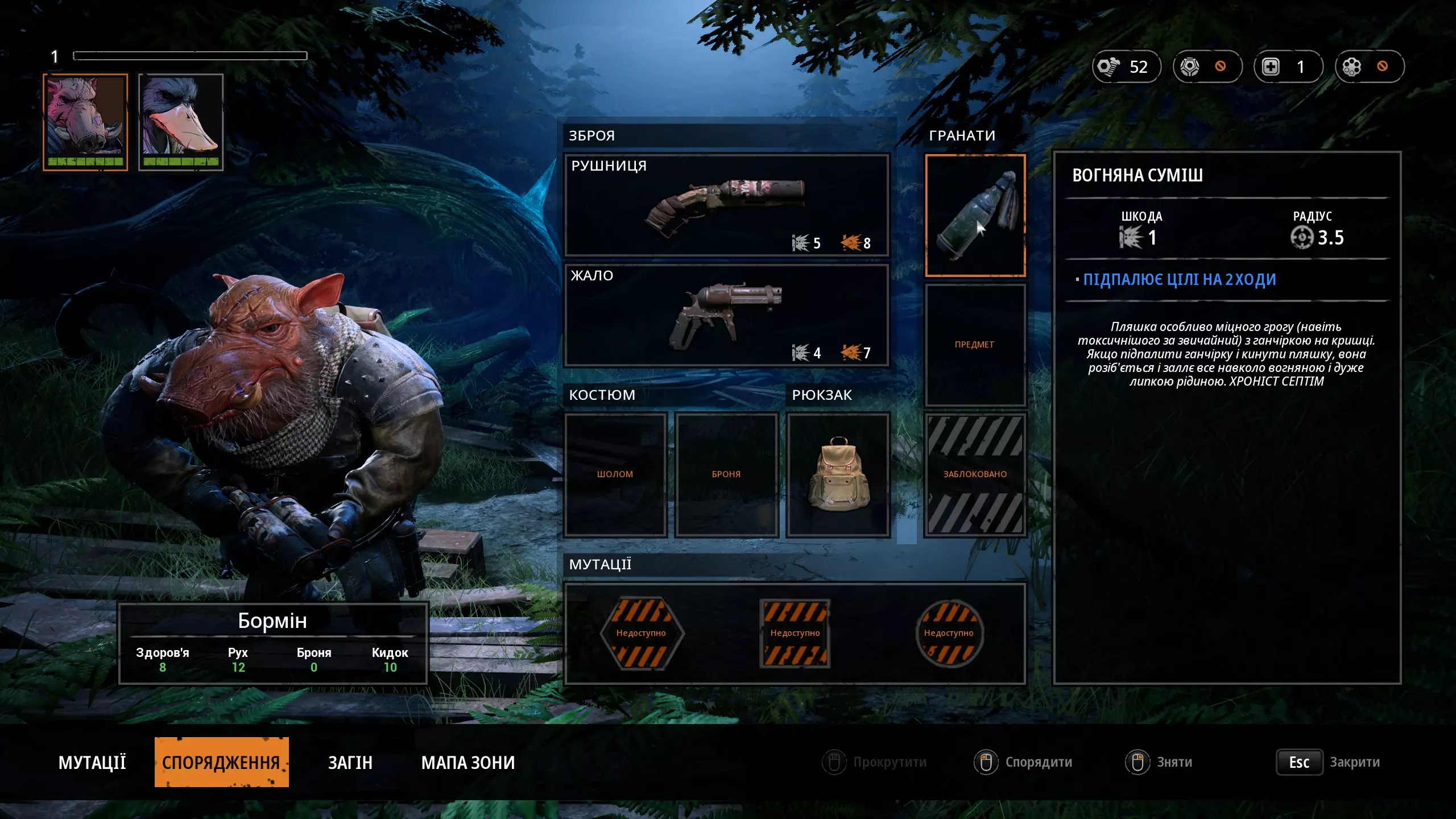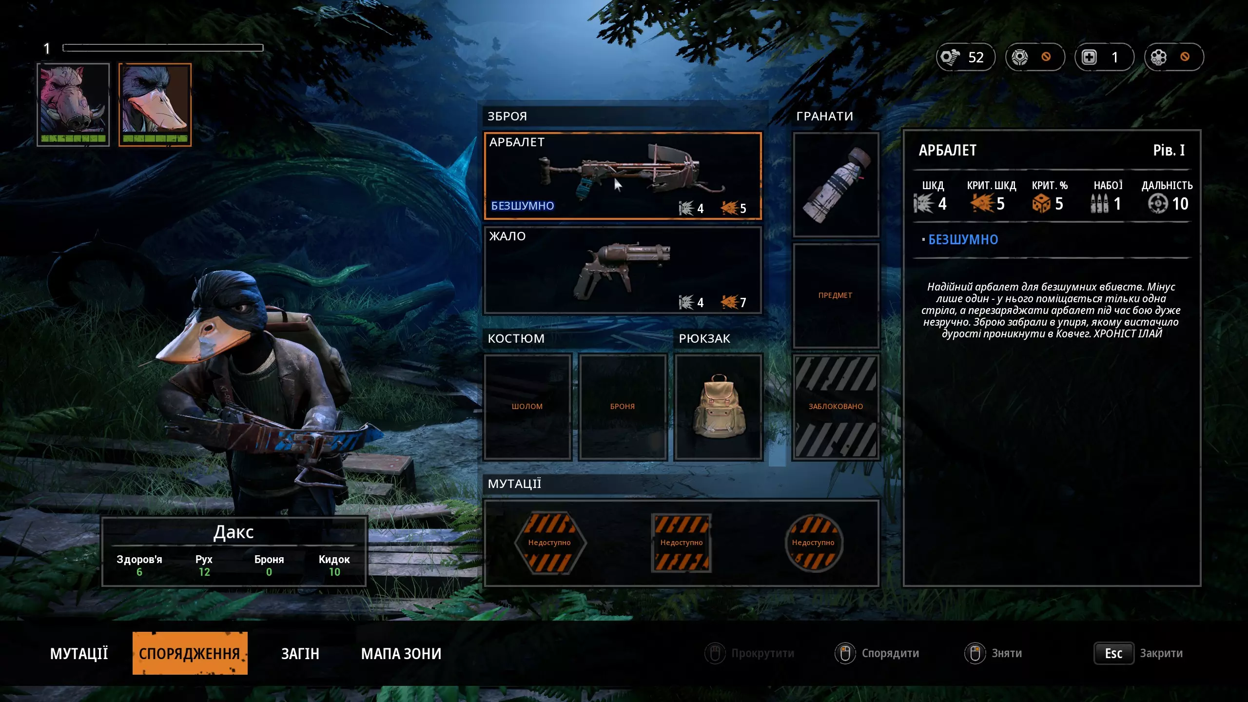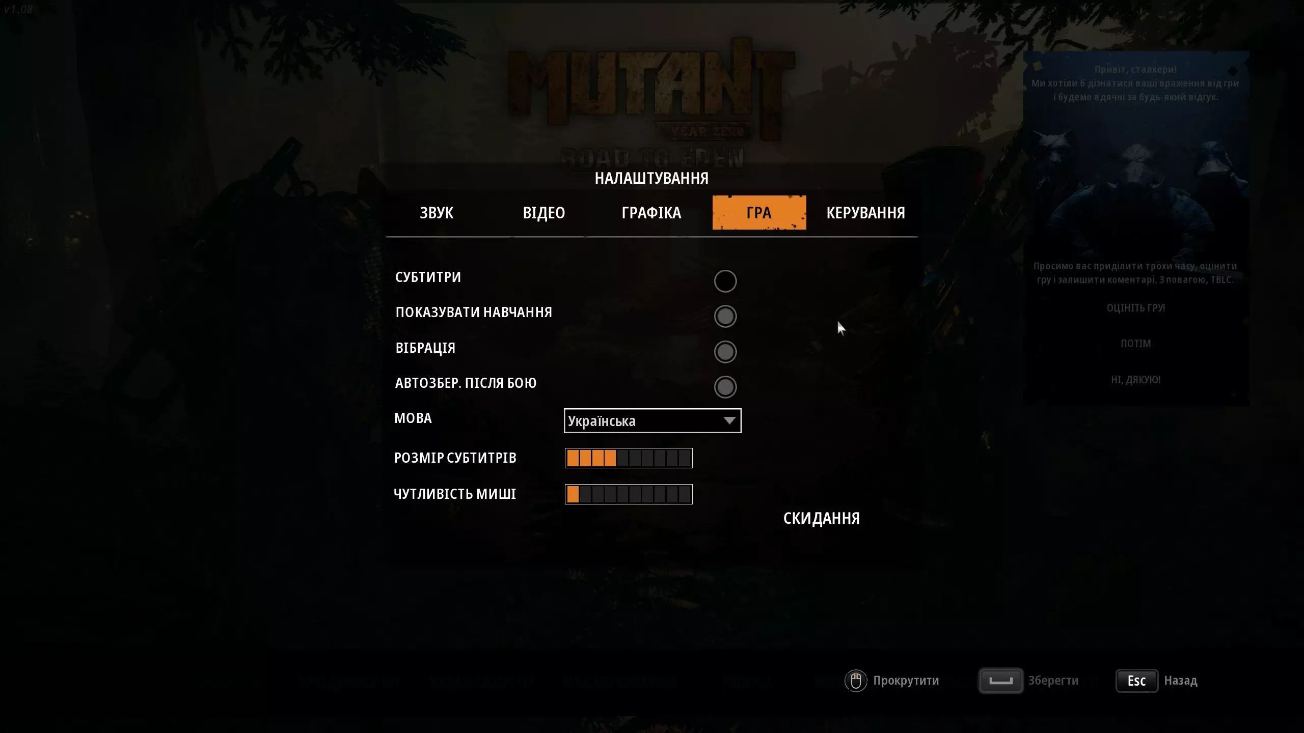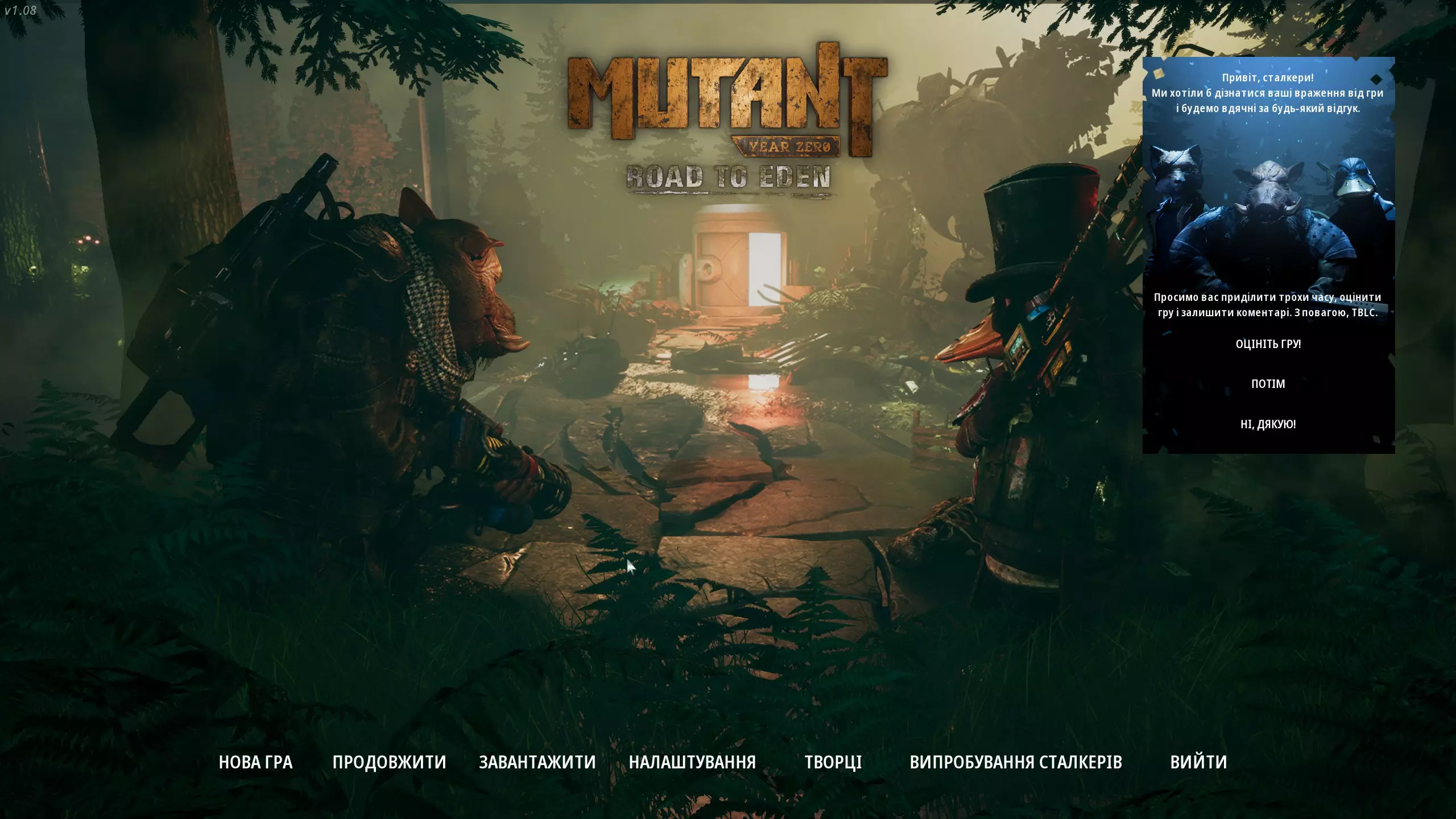 《突变元年:伊甸园之路》乌克兰语文本本地化 安装步骤: 1. 下载文件ZoneUE4-WindowsNoEditor_ukr.pak。 2. 将该文件移动到...Mutant Year Zero ZoneUE4 Content Paks文件夹中。 3. 在游戏设置中选择乌克兰语(将替换英语)。完成!开始游戏并享受吧! 关于翻译: 这是一个非官方翻译,因此可能存在错误。如果安装后游戏出现问题或不满意,只需删除此文件。翻译后的截图