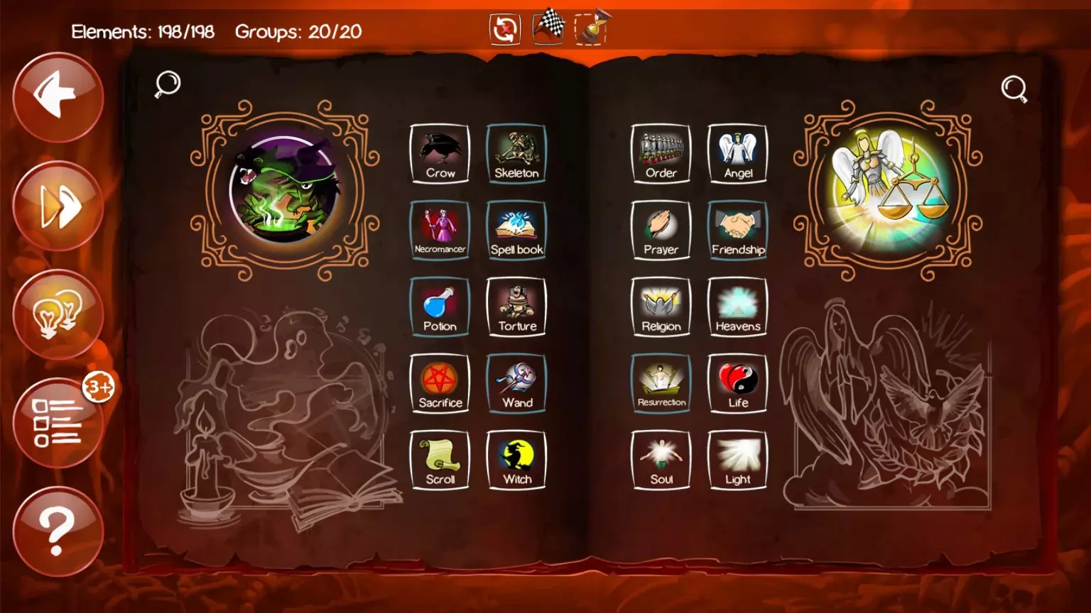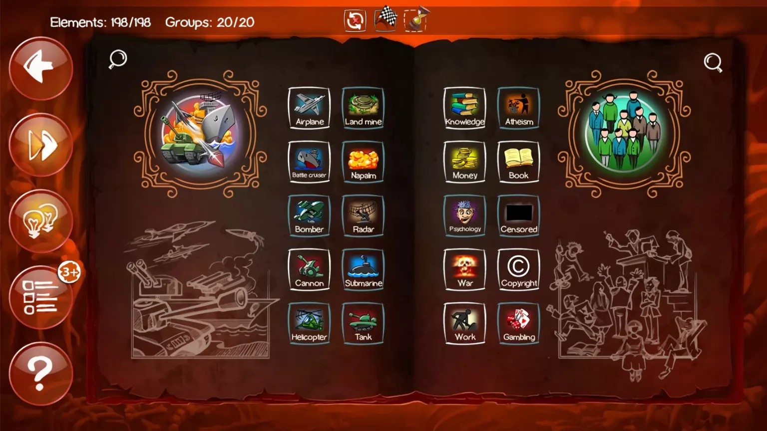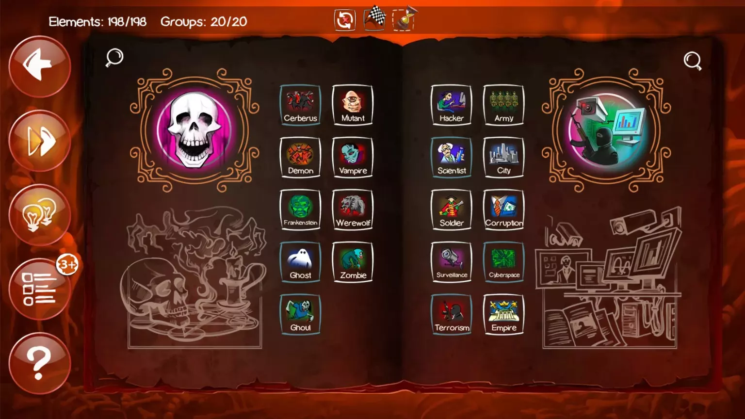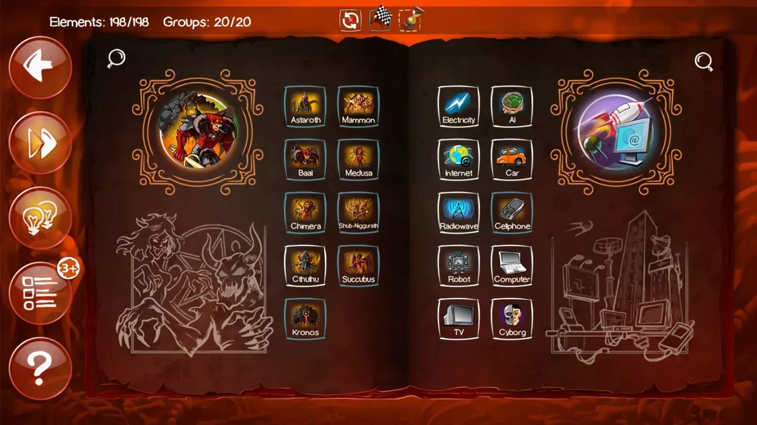 编号 合成公式 1 苹果 + 人类 = 罪恶 + 知识配方 1. 土 + 火 = 岩浆 2. 岩浆 + 水 = 蒸汽 + 石头 3. 火 + 空气 = 能量 4. 石头 + 火 = 金属 5. 火 + 野兽 = 灰烬 6. 人类 + 人类 = 友谊 + 生命 7. 生命 + 光 = 天使 8. 人类 + 天使 = 祈祷 9. 人类 + 祈祷 = 天堂 + 宗教 10. 野兽 + 黑暗 = 恶魔 11. 人类 + 恶魔 = 灵魂 + 尸体 12. 尸体 + 灵魂 = 复活 + 行善者 13. 男人 + 女人 = 性 14. 人类 + 生命 = 死亡 15. 水 + 死亡 = 24. 罪恶 + 宗教 = 异端 25. 罪恶 + 尸体 = 谋杀 26. 罪恶 + 性 = 欲望 27. 野兽 + 死亡 = 刻耳柏洛斯 28. 人类 + 黑暗 = 突变体 29. 水 + 恶魔 = 克苏鲁 30. 灰烬 + 灵魂 = 鬼魂 31. 人类 + 野兽 = 狼人 32. 生命 + 尸体 = 僵尸 33. 尸体 + 僵尸 = 食尸鬼 34. 石头 + 魔法 = 蛋 35. 土 + 生命 = 蠕虫 36. 野兽 + 水 = 鱼 37. 蛋 + 蠕虫 = 蛇38 人类 + 知识 = 书籍 16 能量 + 恶魔 = 魔法 39 人类 + 咖啡 = 工作 17 苹果 + 地球 = 种子 40 人类 + 异端 = 无神论 + 心理学 18 能量 + 种子 = 咖啡 41 秩序 + 恶魔 = 版权 19 地球 + 种子 = 树木 + 蘑菇 + 草 42 知识 + 版权 = 金钱 + 邪恶锁链 20 种子 + 蘑菇 = 孢子 43 人类 + 版权 = 律师 21 生命 + 孢子 = 细菌 44 人类 + 傲慢 = 政客 22 火 + 草 = 烟草 45 傲慢 + 政客 = 战争 23 罪恶 + 罪恶 = 傲慢 第二章节:大扭曲 编号:解决方案配方 47 宗教 + 异端 = 教派 112 鸽子 + 女巫 = 乌鸦 48 人类 + 烟草 = 疾病 113 人类 + 酸 = 骷髅 49 人类 + 战争 = 苦难 114 魔法 + 皮革 = 卷轴 50 人类 + 谋杀 = 地狱 115 武器 + 魔法 = 魔杖 51 大地 + 知识 = 石油 116 谋杀 + 宗教 = 献祭 52 空气 + 地狱 = 硫磺 117 水 + 魔法 = 药剂 53 水 + 硫磺 = 酸 118 人类 + 能量 = 巫师 54 石油 + 酸 = 炸药 119 巫师 + 僵尸 = 死灵法师 55 金属 + 炸药 = 炸弹 120 人类 + 愤怒 = 战士 56 蘑菇 + 炸弹 = 核弹 121 战士 + 金属 = 盔甲 57 战争 + 核弹 = 混乱 122 盔甲 + 汽车 = 坦克 58 咖啡 + 烟草 = 毒药 123 纤维素 + 酸 = 火药 59 毒药 + 空气 = 毒气 124 武器 + 火药 = 火器 60 人类 + 石头 =61.人类+金属=武器 62.金属+工作=机械装置 63.草+武器=剃刀藤 64.野兽+疾病=老鼠 65.空气+老鼠=鸽子 66.鱼+武器=食人鱼 67.罪恶+金钱=贪婪+盗窃 68.罪恶+贪婪=嫉妒 69.罪恶+武器=愤怒 70.罪恶+工作=懒惰 71.武器+野兽=食物+血液 72.痛苦+痛苦=折磨 73.人类+折磨=皮革 74.罪恶+ 125.枪械+魔法=AK47 126.炸弹+火箭=导弹 127.导弹+武器=火箭筒 128.枪械+骄傲=沙漠之鹰 129.火焰+武器=火焰喷射器 130.枪械+战士=士兵 131.士兵+炸弹=手榴弹+可爱小玩具 132.大地+大地=地震 133.疾病+混乱=流行病 134.孢子+炸弹=生物武器 135.毒气+导弹=化学武器 136.恶魔+教派=共产主义 137.政客+政客=民主 138.水+地震=海啸食物=暴食139 生物武器+战争=末日75 人类+血液=吸血鬼140 秩序+战争=军队76 空气+吸血鬼=蝙蝠141 军队+政客=帝国+独裁77 野兽+愤怒=狼+神之鞋142 武器+地狱=BFG 900078 能量+金属=电力143 武器+等离子=等离子枪79 尸体+电力=科学怪人+活体解剖者144 外星人+武器=死亡射线枪80 性+金钱=已屏蔽145 士兵+虚空=星际战士81 人类+贪婪=赌博146 房屋+房屋=城市82 秩序+混沌=虚空147 武器+虚空=分解枪83 人类+疾病=病毒148 能量+盔甲=力场84 生命+虚空=外星人149 火箭+战列巡洋舰=宇宙飞船85 草+工作=纤维素150 城市+宇宙飞船=死星86 火焰+能量=等离子151 虚空+炸弹=真空炸弹+太空超级巨星87 恶魔+机械装置=152 知识 + 知识 = 科学家 88 书籍 + 电视 = 电脑 153 政客 + 金钱 = 腐败 89 电脑 + 生命 = 人工智能 154 生命 + 互联网 = 网络空间 90 电脑 + 机械装置 = 机器人 155 知识 + 战争 = 监视 91 人工智能 + 机器人 = 赛博格 156 知识 + 电脑 = 黑客 92 空气 + 电力 = 无线电波 157 战争 + 混乱 = 恐怖主义 93 石油 + 机械装置 = 汽车 158 知识 + 魔法 = 咒语 94 无线电波 + 电脑 = 手机 159 房屋 + 盔甲 = 城堡 95 电脑 + 电脑 = 互联网 160 房屋 + 巫师 = 塔楼 96 无线电波 + 无线电波 = 放射性 161 魔法 + 蛋 = 龙 97 空气 + 汽车 = 飞机 162 人类 + 光 = 精灵 98 飞机 + 虚空 = 火箭 163 野兽 + 蛇 = 九头蛇 99 火箭 + 外星人 = 不明飞行物 164 野兽 + 魔法 = 独角兽 100 虚空 + 火箭 = 卫星 165 鸽子 + 独角兽 = 飞马 101 无线电波 + 火 = 激光 + 科学 166 火 +鸽子 = 凤凰102 火焰 + 石油 = 凝固汽油弹167 野兽 + 死亡 = 刻耳柏洛斯103 武器 + 炸弹 = 加农炮168 激光 + 力场 = 光剑104 水 + 加农炮 = 战列巡洋舰169 恶魔 + 贪婪 = 玛门105 空气 + 无线电波 = 雷达170 恶魔 + 战争 = 巴力106 飞机 + 炸弹 = 轰炸机171 恶魔 + 欲望 = 魅魔107 空气 + 机械装置 = 直升机172 恶魔 + 暴食 = 舒卜-尼古拉斯108 鱼 + 战列巡洋舰 = 潜艇173 恶魔 + 愤怒 = 克洛诺斯109 大地 + 炸弹 = 地雷174 恶魔 + 野兽 = 奇美拉110 书 + 魔法 = 魔法书175 恶魔 + 石头 = 美杜莎111 女人 + 魔法 = 女巫176 恶魔 + 傲慢 = 阿斯塔罗特 全类别100%