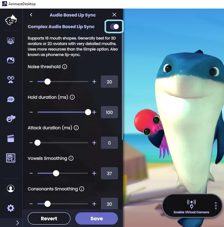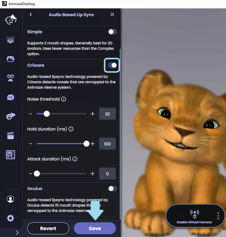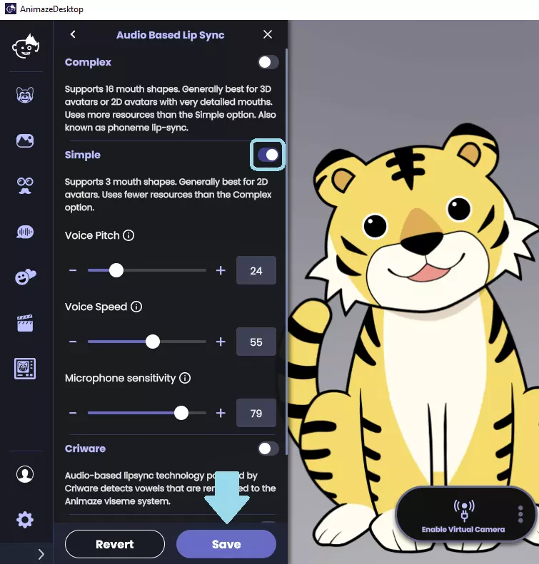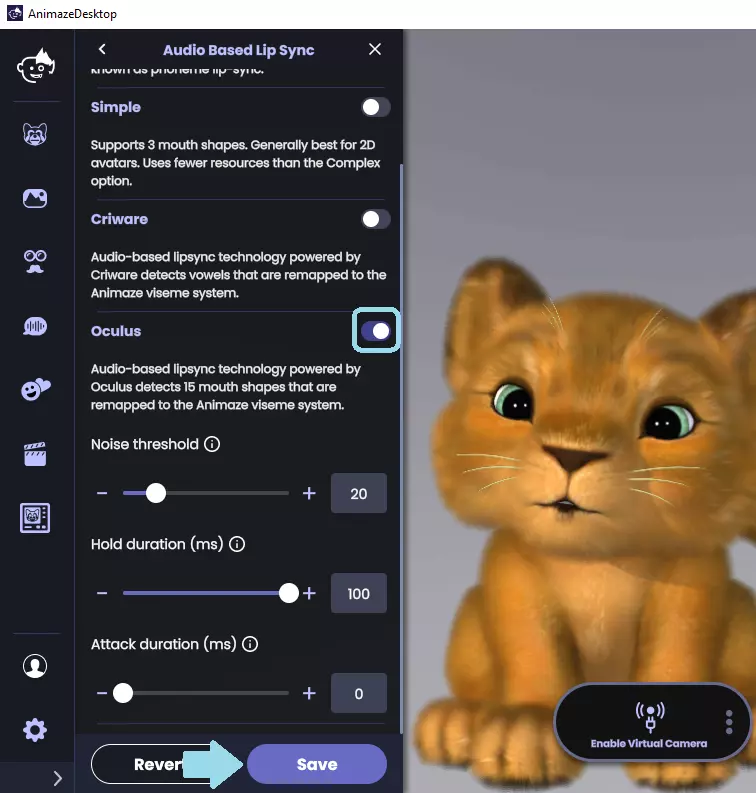 5. 在《Animaze》中,前往设置 > 高级追踪配置 > 基于音频的唇形同步,并将其开启。