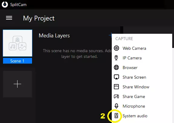 启用可用的唇形同步追踪器之一并对其进行更改后,点击保存以保存你的追踪偏好设置并退出基于音频的唇形同步抽屉菜单。 如何将音频文件直接输入基于音频的唇形同步 你可以使用SplitCam让虚拟形象对音频文件进行唇形同步。以下是实现此操作的步骤: 1. 在SplitCam官方网站免费下载SplitCam 2. 然后通过点击媒体图层(加号)创建场景