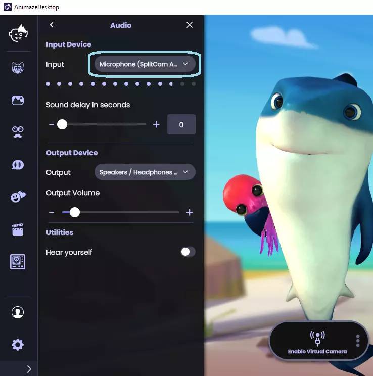 4. 进入Animaze应用 > 设置 > 音频,然后在Animaze中选择SplitCam麦克风作为输入源。