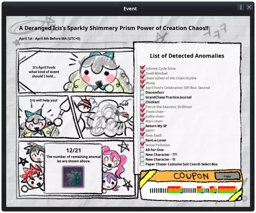 《永恒冒险》活动公告 1. 愚人节主题活动(2026年4月1日(周三)维护后 - 2026年4月8日(周三)维护前(UTC+0)) - 活动期间游戏内部分图像将进行变更。 在游戏过程中寻找愚人节主题的图像吧! 2.《GrandChase》愚人节增益活动(2026年4月3日(周五)06:00-2026年4月6日(周一)06:00(UTC+0)) 1. 副本内经验值+30%、GP获取量+30%、物品掉落率+15% 2. 活动排除副本:噩梦马戏团、怪物列车301、饥饿宠物的反抗、月光村、愤怒BOSS、塔林的复仇、史莱姆王副本、试炼森林、试炼之塔、全大陆次元门 《GrandChase》愚人节异常现象(2026年4月1日(周三)维护后-2026年4月8日(周三)维护前(UTC+0)) 1. 寻找各种隐藏的异常现象即可获得奖励! 2. 找到所有异常现象后将揭晓特殊兑换码!