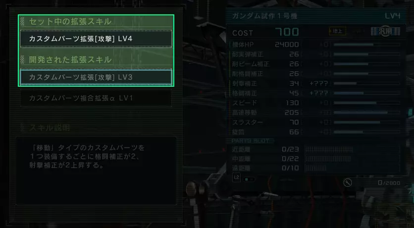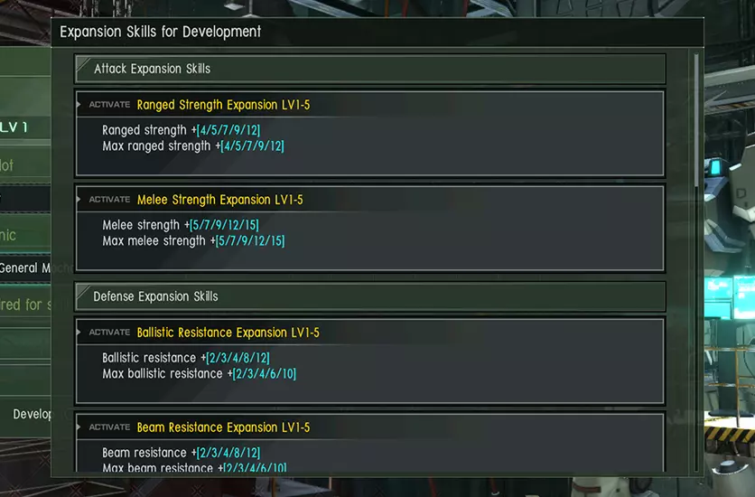 《机动战士高达 激战任务2》更新内容 1. 扩展设施的额外改进 为进一步提升扩展设施的易用性和可见性,已进行以下改进。 2. 改进同类型低等级技能开发时的系统表现 当开发与当前装备同类型的扩展技能时,该技能的低等级版本将显示为灰色且不再可选择。