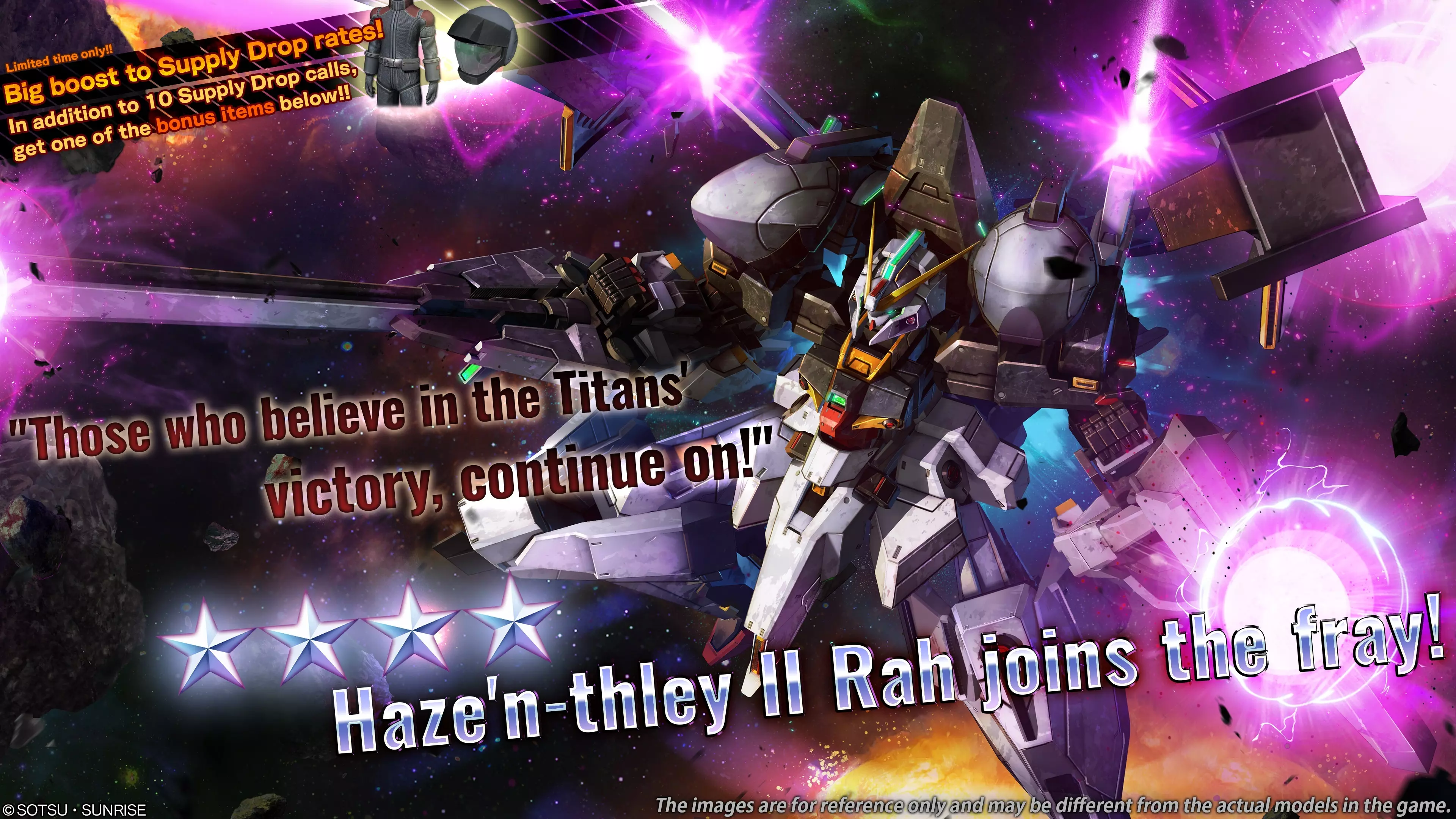 ■活动时间 [PDT] 2026年4月2日 01:00 – 2026年4月8日 21:30 [预定] [CEST] 2026年4月2日 10:00 – 2026年4月9日 06:30 [预定] ■新增内容 ■机体 ・★★★★ 海兹尔Ⅱ拉赫 LV1(泛用型机体,陆战/宇宙战通用,cost:700) ※上述MS为月度MS Bonus机体。 ■机体特点 ・cost700的泛用型机体。 ・高达TR-6的海兹尔Ⅱ高速战斗形态,搭载有赫鲁杜Ⅱ支援部件。 ・海兹尔是作为加布罗的进化型开发的提坦斯主力MS,具备对抗奥古Z计划系列的能力。其搭载的武装包括多种光束武器,如增强型步枪、肩部搭载的大型粒子炮、绞车炮以及腹部扩散型大型粒子炮。此外,机体还配备了I力场发生器,根据战况合理运用可带来显著战果。 该MS被归类为区域制空型MS,拥有卓越的火力和推进力,曾被部署于殖民地激光的夺回作战中。 可在地面和宇宙两种环境下部署。 ※本视频内容可能与实际产品存在差异。请务必查看活动日程,以免错过任何内容。 技能【固定火力系统】等级2 ・使用固定射击武器时,该技能激活。 ・降低受到远程攻击时的硬直,以及连续受到无压制效果攻击时的击退。 ・同时减少受到的远程攻击伤害。 ・此效果在集中射击时不适用。 技能【过载】等级3 ・按下【特殊武器】键可完全恢复所有武器的热量槽,并在一段时间内进入过载模式。 ・该技能有时间限制,激活期间降低武器的热量上升速度,并缩短集中射击时间。 ・技能结束后,受影响的武器会立即进入过热状态。此技能每出击一次仅可发动一次。 【10连补给抽取额外奖励:限定驾驶员道具】 从[PDT]2026年4月2日01:00/[CEST]2026年4月2日10:00开始,进行10连抽取可额外获得1个随机限定驾驶员道具。