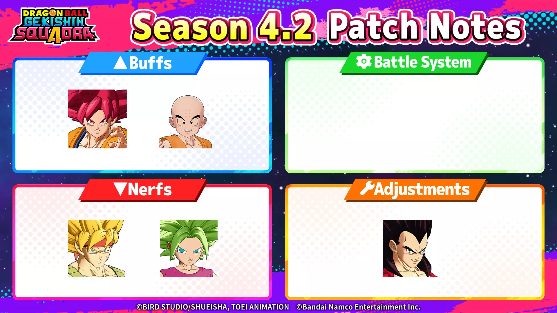 新英雄焦点胶囊现已推出! 限时提供精选的超级赛亚人之神贝吉塔表情与特效,以及超级贝吉特的破核闪光(团队终结技特效)! 用最新的自定义内容为你的战斗增添活力! 活动期间: 2026年4月1日上午6:00 – 2026年4月22日上午5:59(UTC) 重要说明 ・新表情和特效也已添加至【奖励赛季4】奖励G胶囊中。 ・活动结束后,以下表情和特效将暂时无法通过【奖励赛季4】特别G胶囊获取。 ▼超级赛亚人2开芙拉 ・新超级战士的诞生!【表情:开始】 ・索尼克重拳(终结技攻击特效) ▼超级赛亚人4贝吉塔 ・满月誓言(表情:MVP) ■超级赛亚人神贝吉塔全新【神之战斗服(破损)】皮肤现已上架商店! 即使身着这件破损的战斗服,也要带着坚定不移的骄傲战斗到底! ───────────────────────────────────────────────────────────────────── 第四赛季第2版更新说明现已发布! 此处汇总了第四赛季第2版开始时实施的所有调整内容。