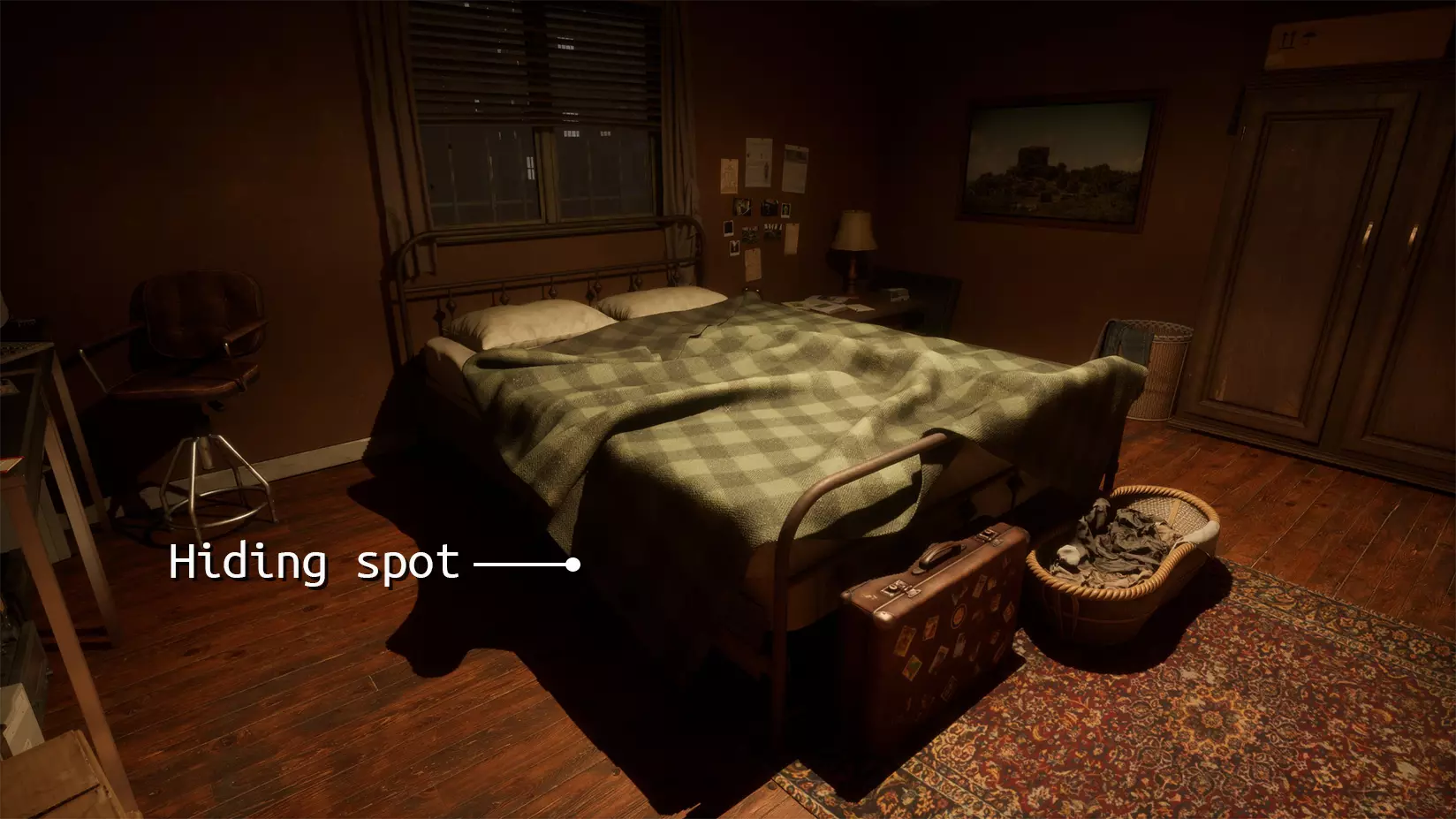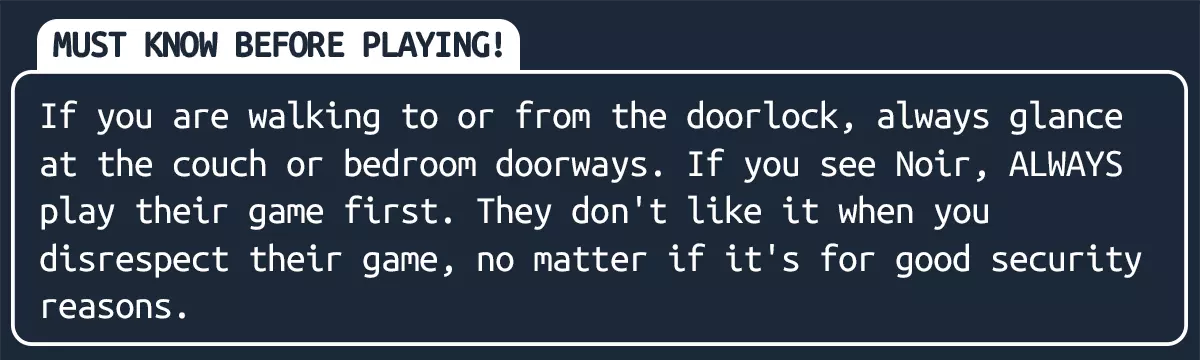男性 Noir 会在你的公寓、走廊和屋顶生成。当你坐在电脑前时,需要时不时站起来检查周围环境。 他会在以下位置生成: 电视前 房子中央 电脑旁 沙发后面 屋顶 卧室的床前 走廊 浴室 躲避男性 Noir 的方法:当你看到他时,用手电筒照他。转过身,数到十。然后他就会消失。