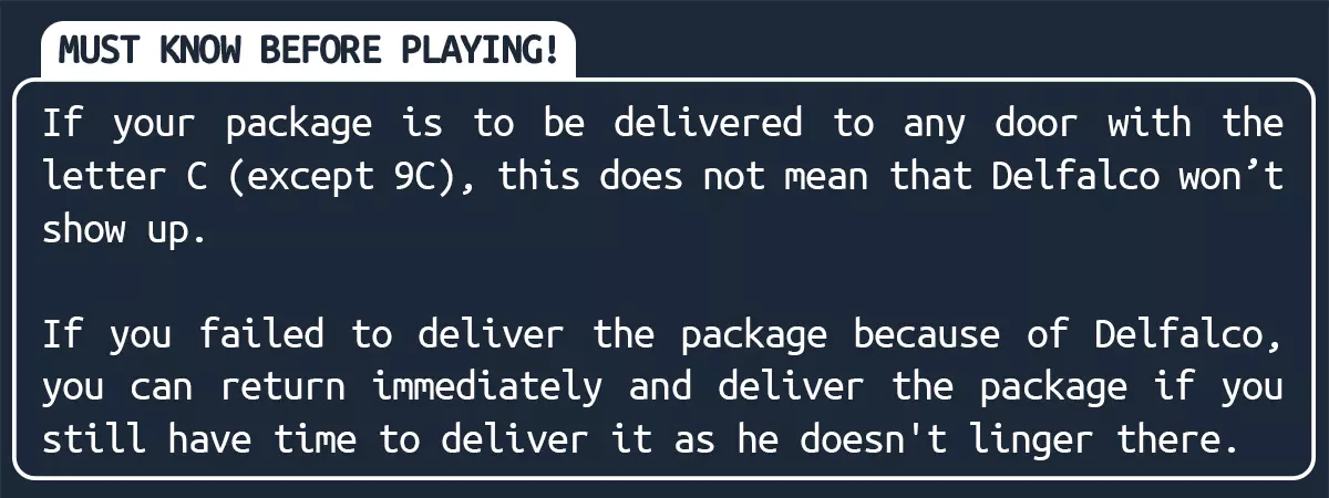 现在我该怎么办?他会在你下班前一直试图追捕你。你可能会在几种情况下遇到他,每种情况都有其对应的躲避方法。 在你的公寓里:如果你听到口哨声,意味着他即将进入你的公寓并对你不利。听到口哨声时,试着起身关掉一些灯,这能让他更快放弃。关灯并非必须,你也可以躲到床底下,等待他离开。他离开时,会关上你公寓的门。 在屋顶:如果你听到电梯发出“叮”的一声,立刻跑到藏身之处。他会在周围徘徊查看你是否在那里。当他离开时,你会听到另一声“叮”。 在监控摄像头看到他后走向走廊:他会在除你所在楼层外的每一层生成。派送包裹时,不要浪费体力。你会需要体力的。走到派送包裹的门前。当你靠近走廊中间时,他会生成。如果你看到前方有门打开,立刻转身跑向电梯。进入电梯后,他不会再追你。