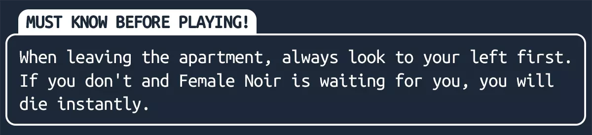 女性 Noir 会在走廊和屋顶生成。她可以在建筑内的任何走廊生成,包括你的走廊。 躲避女性 Noir的方法:当你看到她时,缓慢靠近她,不要奔跑。当她歪头时,停下。转过身,并且不要触碰鼠标。在她说“不要动”之后,数到十,然后她就会消失。我重复一遍,完全不要触碰鼠标。