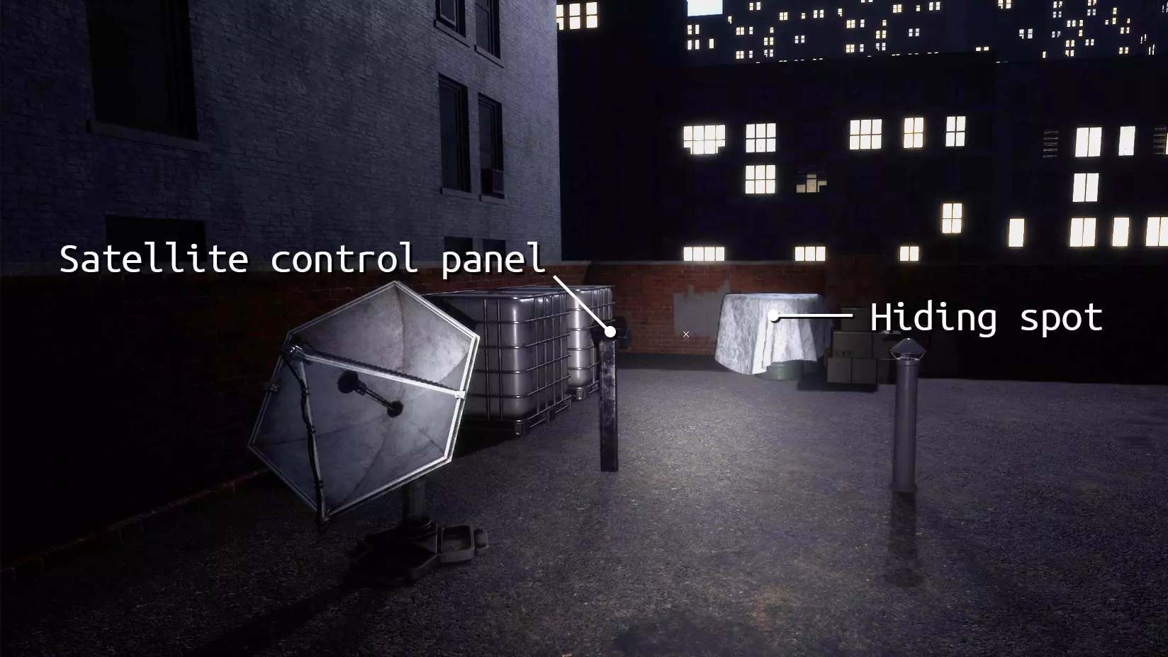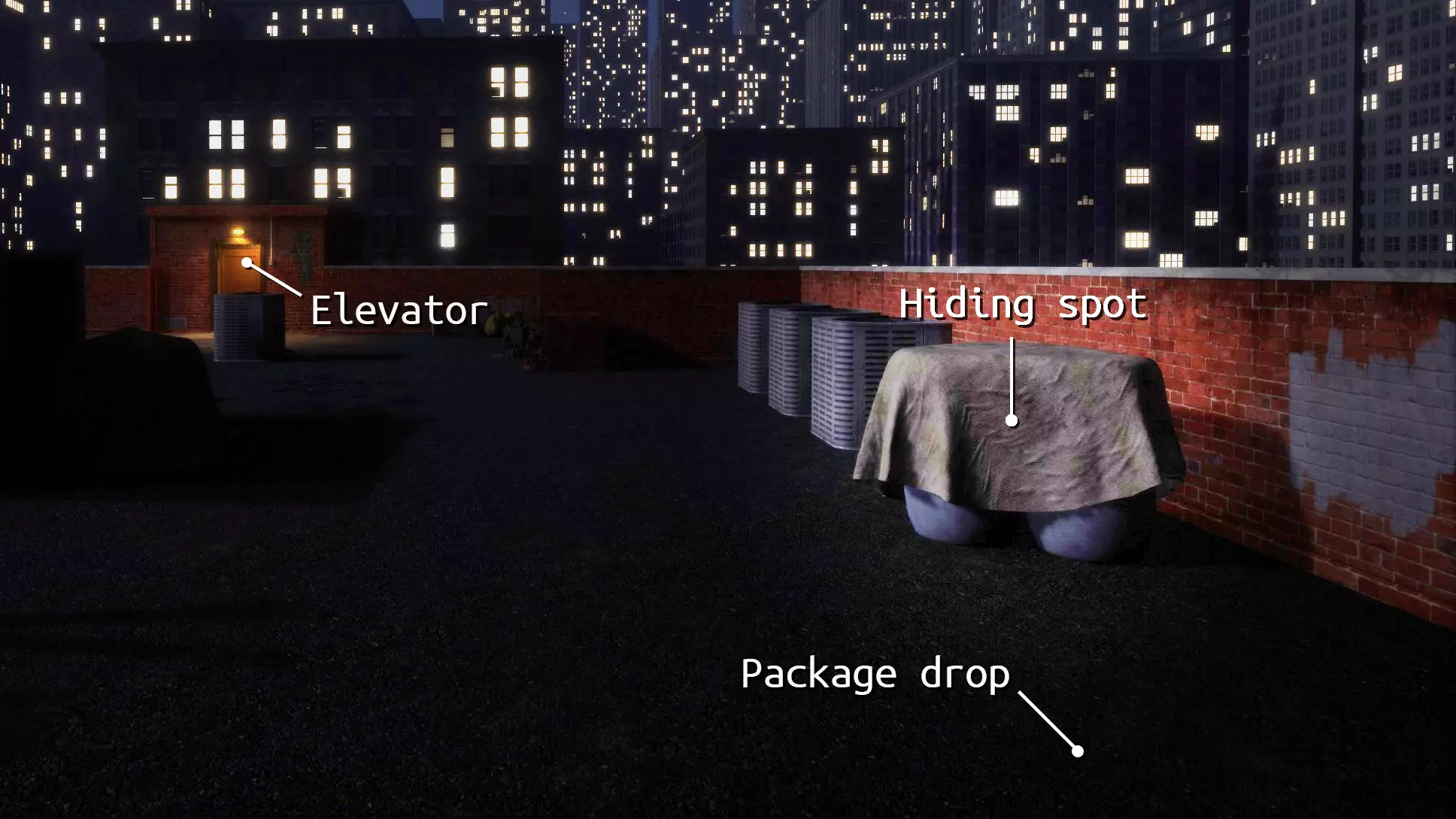 我拿到了包裹/修好了天线。如果你靠近电梯,可以跑到电梯那里挡住他的视线。不要站着不动。四处跑动时不要打开手电筒。如果需要,只需瞬间打开手电筒。 我在包裹或天线旁边。包裹和天线附近有一个藏身点。躲藏时,你可以窥视。但只有在必要时才窥视。不要过多窥视,否则他会看到并向你开枪。