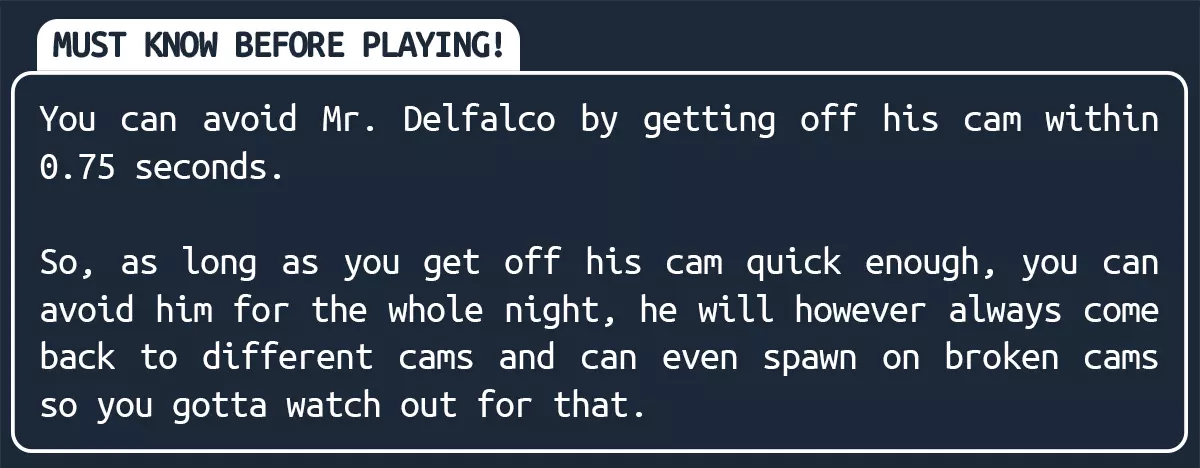 我不打算更新本指南,你可以自由使用这些信息来创建新的指南。 在本指南中,你将了解威胁、如何规避它们以及可能改变你值班结果的游戏机制。或许还有一些你可能想知道的其他内容。他们说这应该是个平静的夜晚,但事实并非如此。 基础游戏内容在游戏内教程中已有完美说明。本指南可能存在一些不准确之处。如果你发现任何错误或遗漏的信息,请在评论区指出。 拿起你的手电筒吧!手电筒会在以下位置之一生成:床头柜上、电脑桌上、前门旁的圆桌、客厅的电视柜上、浴室柜内、沙发后面的桌子上、厨房台面上、卧室里电视机旁的柜子上。 灯光 威胁与灯光的关联 开启更多灯光:降低 Noir 生成几率、提高 Lucas 激光出现几率、延长激光搜索时间、延长 Delfalco 先生搜索时间。 关闭更多灯光:提高 Noir 生成几率、降低 Lucas 激光出现几率、缩短激光搜索时间、缩短 Delfalco 先生搜索时间。德尔法尔科搜索时间 电灯开关位置:浴室、厨房、电脑桌、前厅角落、电脑室墙壁(门旁)、卧室墙壁(门旁) 时间概念与每小时配额 游戏内1小时相当于现实15分钟。45分钟套餐对应现实约11.25分钟,30分钟套餐对应现实约7.5分钟,20分钟套餐对应现实约5分钟。 每小时需提交一定配额的报告。若当前小时提交的报告超过配额,超出部分将结转至下一小时。休闲模式任务配额:晚上10点 - 1份报告 晚上11点 - 2份报告 午夜12点 - 3份报告 凌晨1点 - 4份报告 凌晨2点 - 5份报告 凌晨3点 - 7份报告 普通模式任务配额:晚上10点 - 2份报告 晚上11点 - 4份报告 午夜12点 - 5份报告 凌晨1点 - 6份报告 凌晨2点 - 8份报告 凌晨3点 - 9份报告 凌晨4点 - 10份报告 声音提示 游戏中有大量声音,比如钻孔声、敲门声和狗叫声等。但你真正需要留意的只有两种声音。 第一种是在你的公寓里。如果你在普通模式下触发了德尔法尔科,此时你唯一应该听到的就是德尔法尔科的口哨声。建议将游戏音量调大以听清这个声音。 第二种是在屋顶。这个声音也是德尔法尔科即将到来的信号。如果你在屋顶时听到电梯发出“叮”的声音,就应该躲藏起来。除了这些声音外,你听到的其他所有声音都对你没有任何用处,它们只是用来分散你的注意力并制造紧张氛围的。所有躲藏点