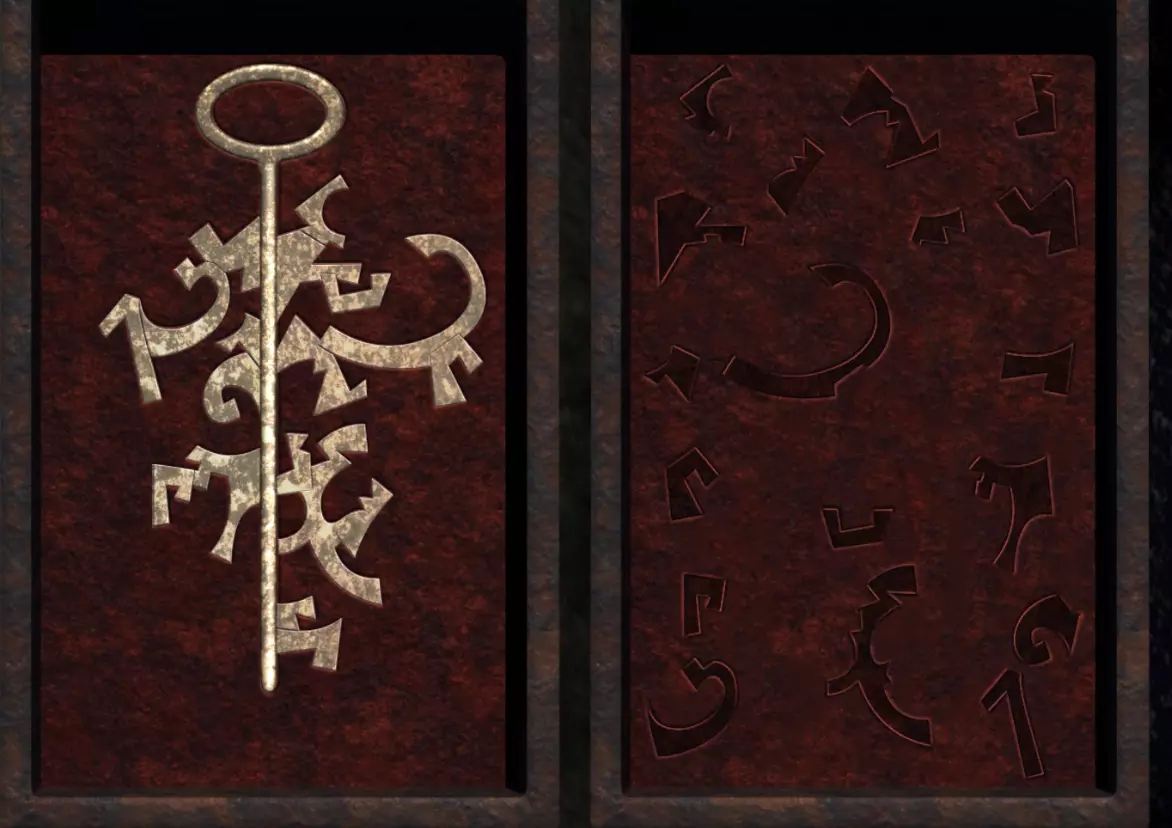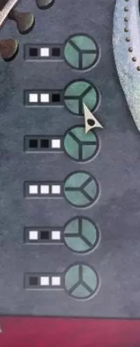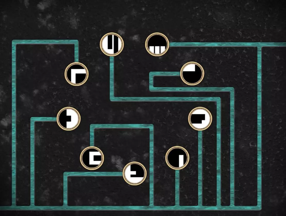墙壁会向一旁移开。你将看到下一个谜题。 这里需要观察按钮及其根据前一张图中的线路所对应的位置,然后根据当前图中的连接关系旋转按钮。 例如,若以带有黑白锯齿的按钮为例,第一张图中线路从右侧连接到该按钮。第二张图中线路同样从右侧连接到该按钮,因此无需旋转此按钮。如果拿起带有两条线(一条长一条短)的按钮,在第一个线路图中,导线从上方接入,此时长线位于短线的左侧。在第二个线路图中,需要在脑海中翻转线路图,使导线同样处于上方,然后旋转按钮,让长线再次位于导线下方且处于短线的左侧。