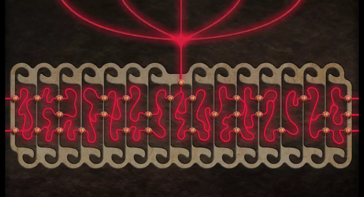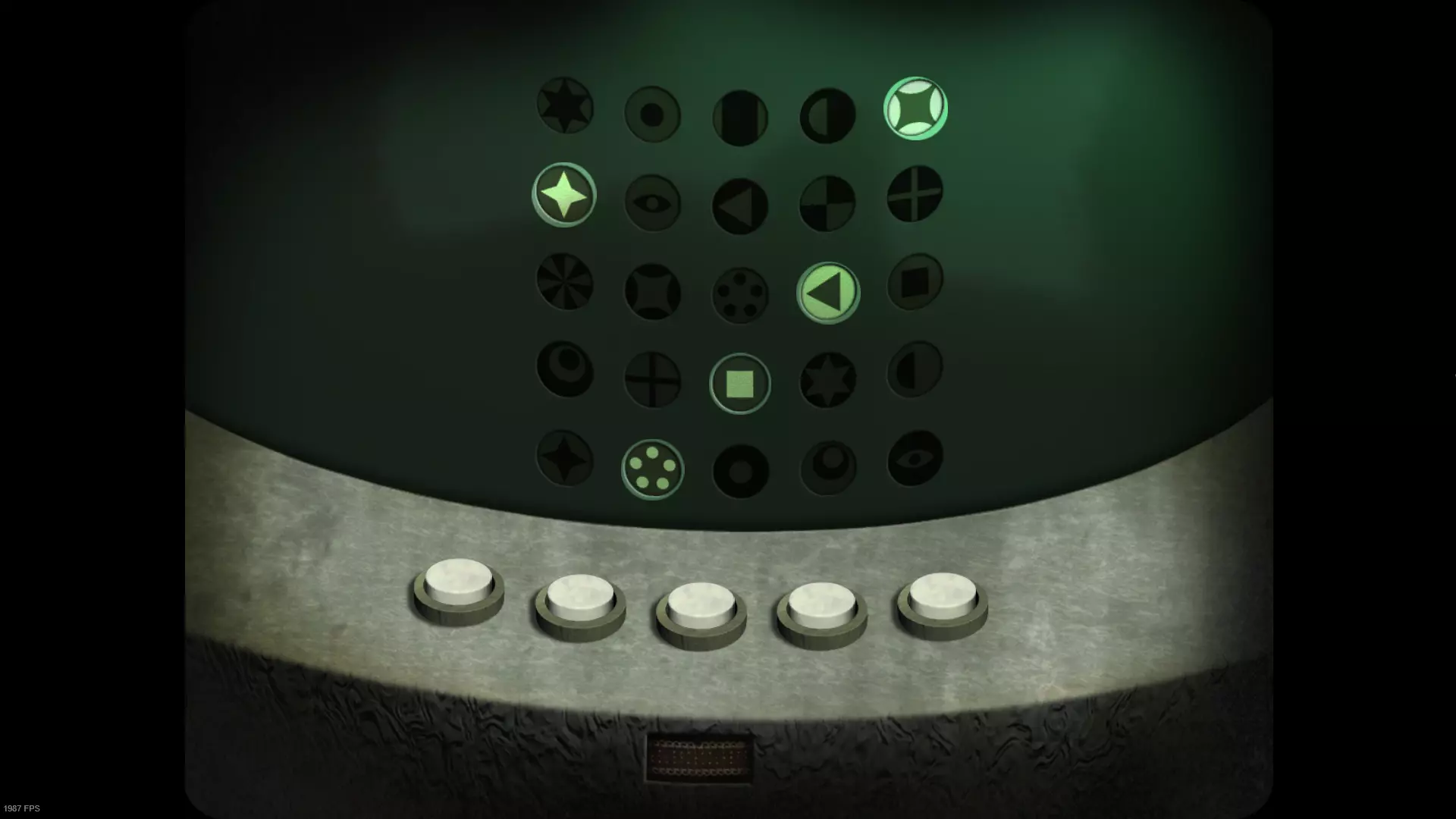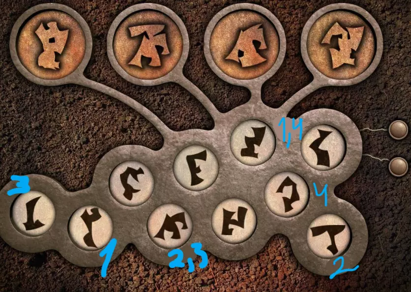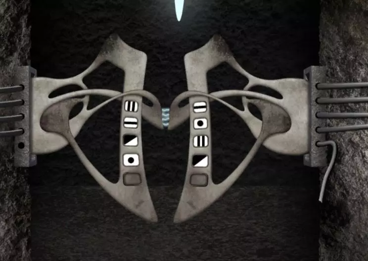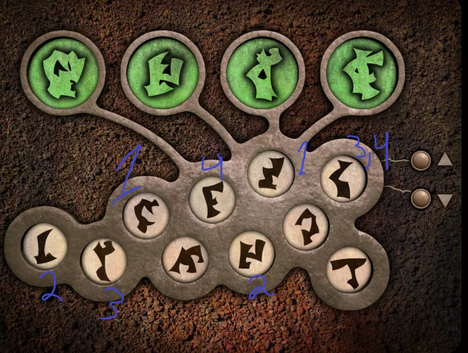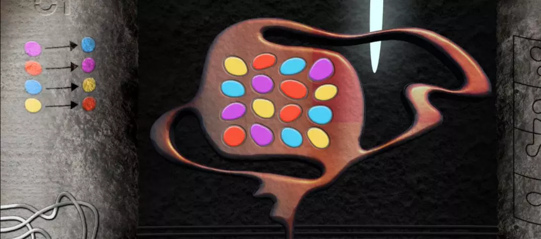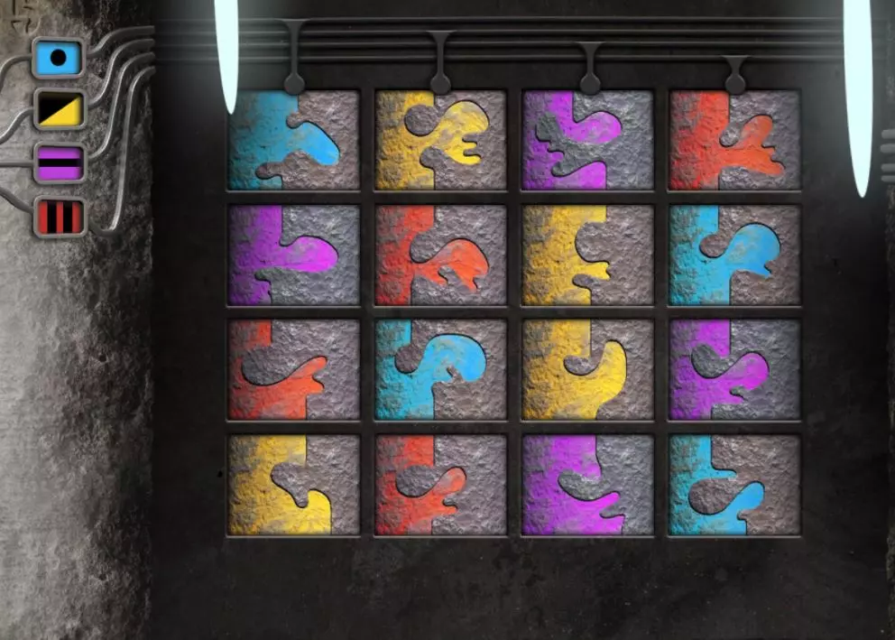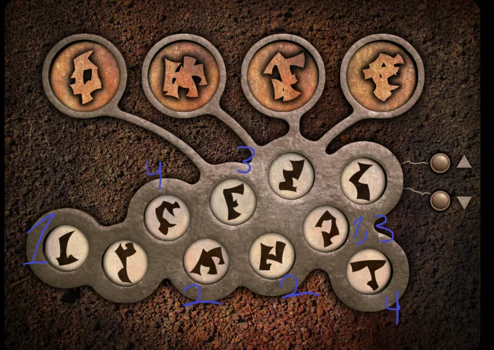 回到带有方形屏幕的场景。屏幕已经亮起。要正确排列符号,需要回到带有橙色按钮装置的场景。在该装置右侧的柱子上画有一个图案;需要明白这个图案是连续的。 回到带有方形屏幕的场景。顶部一行符号无法移动,其余行可以水平移动。从第二列开始会更简单,因为你刚刚在柱子上见过这个图案。