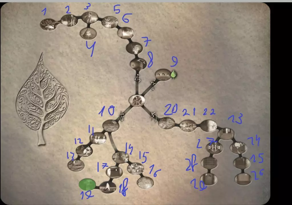 获取蓝色种子。返回仪式大厅并获得第三十片叶子。接下来需要将叶子交给树上的人们并观看结局动画。 一次游戏中不存档可获得成就Sapogi-skoroho dy。 不使用提示进行游戏可获得成就Geniy。