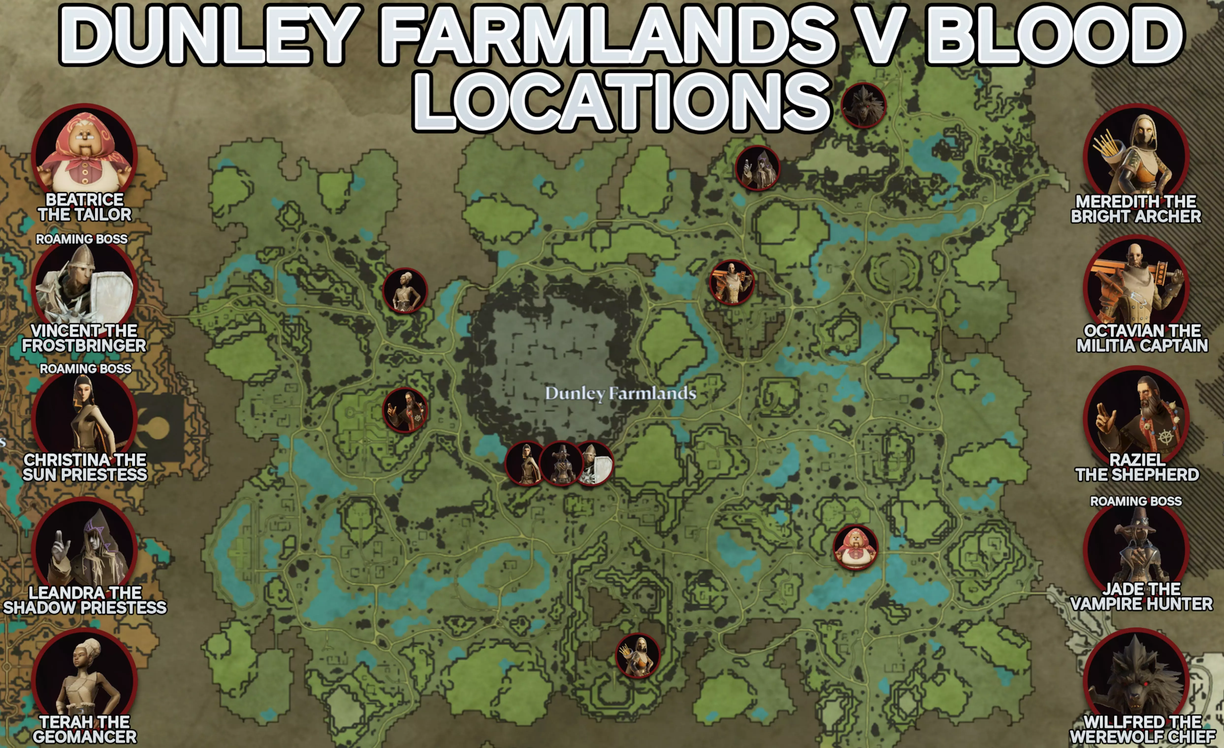 邓利农场区域共有10个V血 Boss。 表格中带有下划线的为漫游血 Boss。名称 等级 奖励 比阿特丽斯裁缝 38 能力:人类形态 建筑:织布机、各式窗帘 配方:猎人斗篷、布料、棉纱 文森特冰霜使者 40 能力:冰霜屏障、冰霜之幕 建筑:牢房 配方:强化木板 克里斯蒂娜太阳女祭司 44 能力:炼狱 配方:玻璃、空玻璃瓶、神圣抗性药水、血玫瑰药水 莉安德拉暗影女祭司 46 能力: spectral assassin 建筑:珠宝制作台 配方:天灾吊坠、天灾石、骷髅祭司 特拉大地法师 48 能力: spectral guardian 建筑:宝石切割台 配方:攻城傀儡石、普通宝石 梅雷迪思光明弓箭手 52 能力: sanguine coil 配方:羊毛线 屋大维民兵队长 58 能力:镜像打击 建筑:铁砧配方:暗银锭、黎明荆棘套装、暗银武器 牧羊人拉齐尔 60级 能力:猩红光束 建筑:雅典娜图书馆 配方:银抗药剂、腐化神器 吸血鬼猎人杰德 62级 能力:混沌弹幕 配方:大型爆炸箱、原始血 essence 狼人首领威尔弗雷德 64级 能力:心脏打击 配方:神圣抗性 flask 所有诅咒森林中的V血 Boss