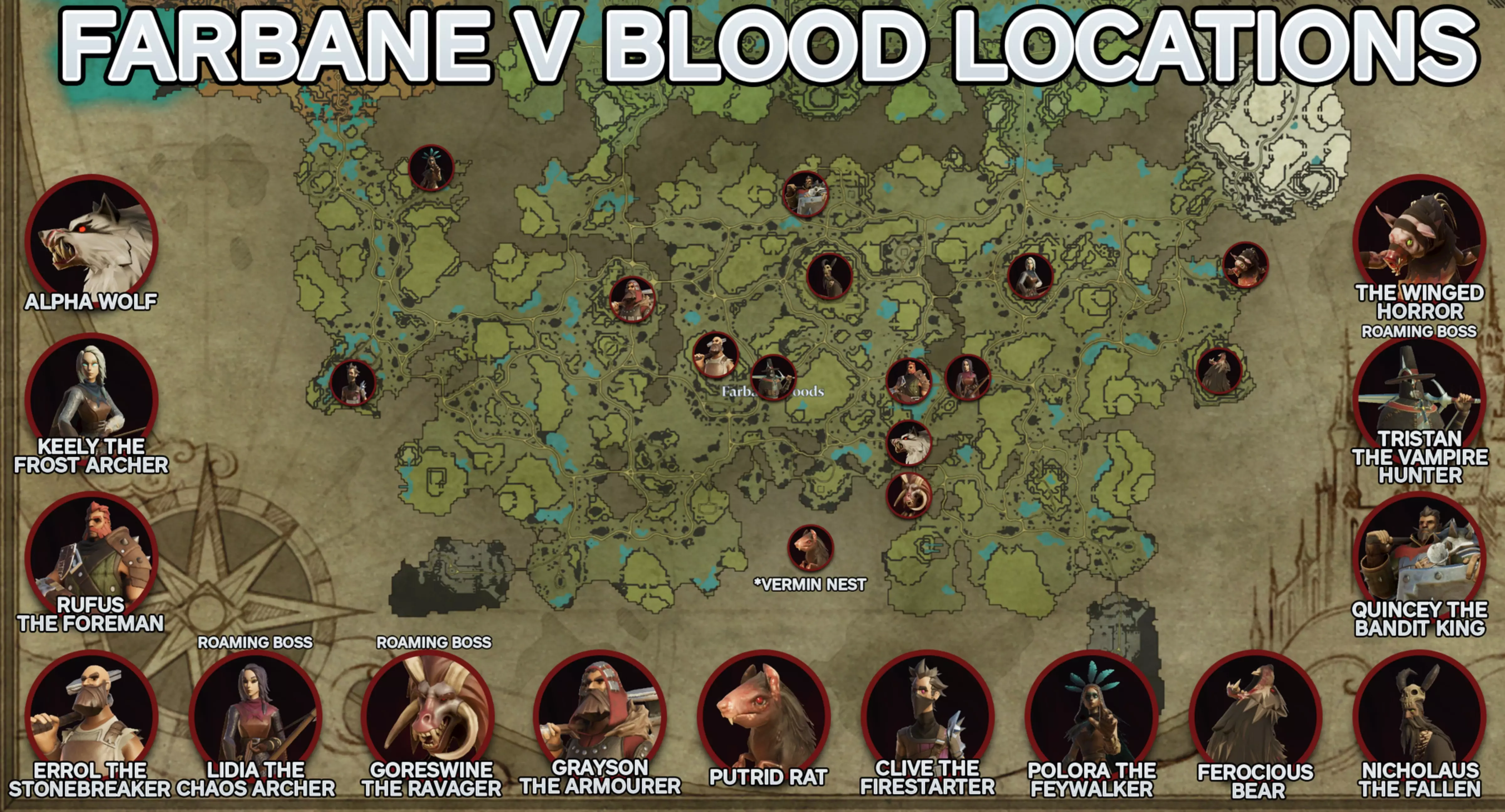 法班恩森林中有15个V血 Boss。表格中带有下划线的为游荡型血 Boss。名称 等级 奖励 阿尔法狼 16 能力:狼形 碎石者埃罗尔 20 能力:余震 建筑:大型储物箱 工头鲁弗斯 20 能力:血怒 建筑:木工台 配方:猎人十字弓、钓鱼竿、雕刻木、画框 冰霜弓箭手基利 20 能力:冰霜蝙蝠 建筑:制革厂 配方:旅行者裹布、空水壶、皮革 混沌弓箭手莉迪娅 26 能力:混沌齐射 建筑:吞噬者 盔甲匠格雷森 27 能力:绯红庇护 建筑:五指工作台、长板、各式雕像 配方:磨刀石 劫掠者戈尔 swine 27 能力:尸爆术、骨之帷幕 建筑:坟墓、“夜曲”栅栏 配方:骷髅、食尸鬼 纵火者克莱夫 30 能力:混沌之幕 建筑:炼金台附魔火盆组合、附魔火炬组合 配方:硫磺、小型爆炸箱 腐臭老鼠 30级 能力:老鼠形态 精灵行者波洛拉 34级 能力:幽魂之狼、幻象之纱 建筑:吸血鬼传送门、金色地板 配方:小型大蒜抗性药剂 凶猛熊 36级 能力:熊形态 建筑:毛皮地毯 强盗王昆西 37级 能力:混沌屏障、无情冲锋 建筑:铁匠铺、裁缝台 配方:铁锭、铁制武器、空心尖牙战斗装备 堕落者尼古拉斯 37级 能力:瘟疫、亡灵结界 建筑:书房 吸血鬼猎人特里斯坦 46级 能力:嗜血渴望 配方:高级血 essence 有翼恐怖 78级 能力:冰霜漩涡 所有神圣山脉中的V血 Boss