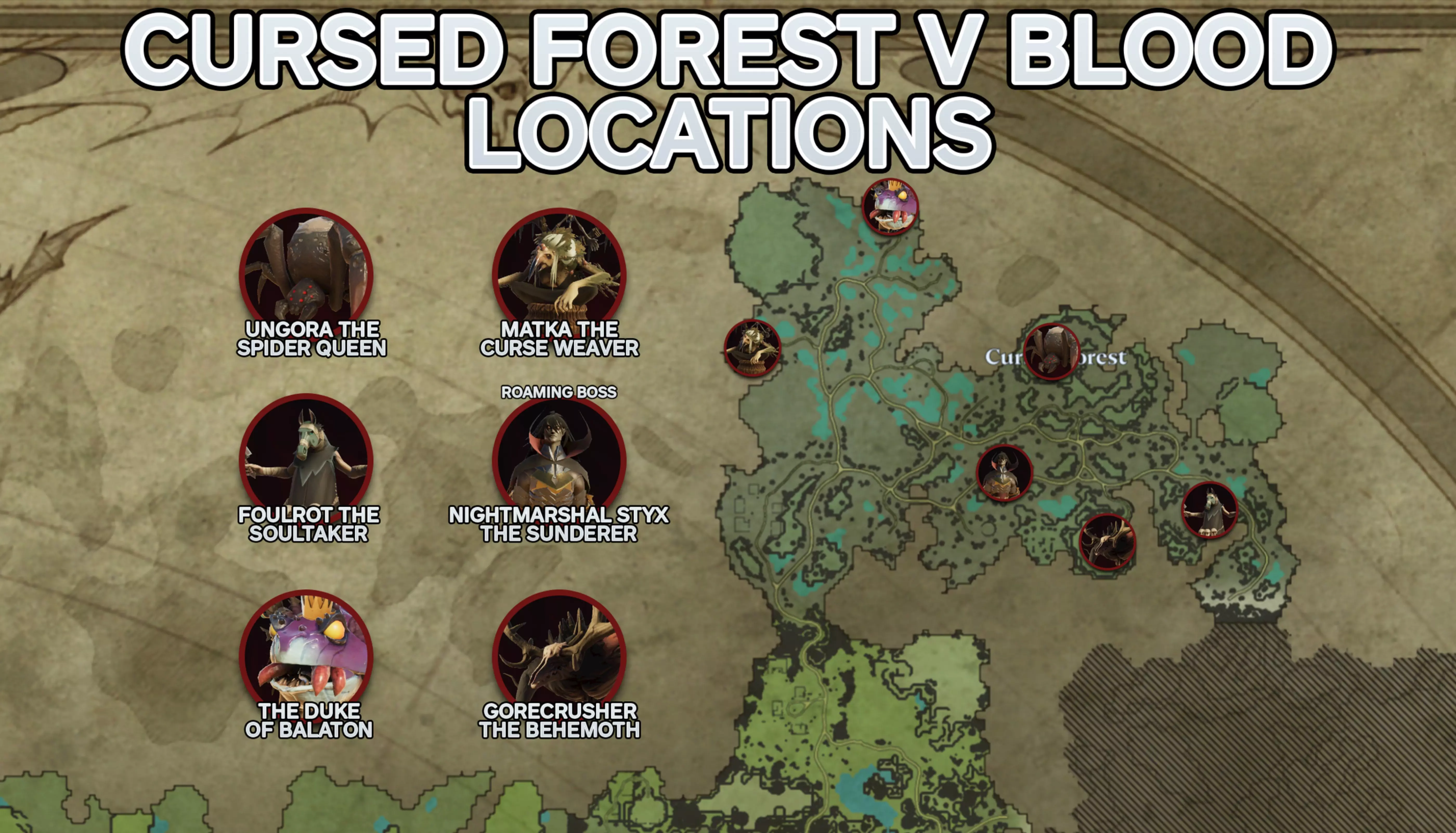 诅咒森林中有6个V血 Boss。 表格下方带有下划线的为游荡型血 Boss。名称 等级 奖励 蜘蛛女王昂戈拉 60 能力:不稳定、蜘蛛之拥 配方:幽灵线、丝绸、小蜘蛛 噬魂者腐臭 62 能力:迷雾 trance 配方:幻影面纱、 spectral 粉尘、女妖 巴拉顿公爵 62 能力:蟾蜍形态 织咒者玛特卡 72 能力:不稳定蚊子 配方:蓝图、蚊子 破甲者夜元帅冥河 76 能力:蝙蝠形态 巨兽碎肉者 78 能力: wisps 之舞 银光山丘的所有 V 血 Boss