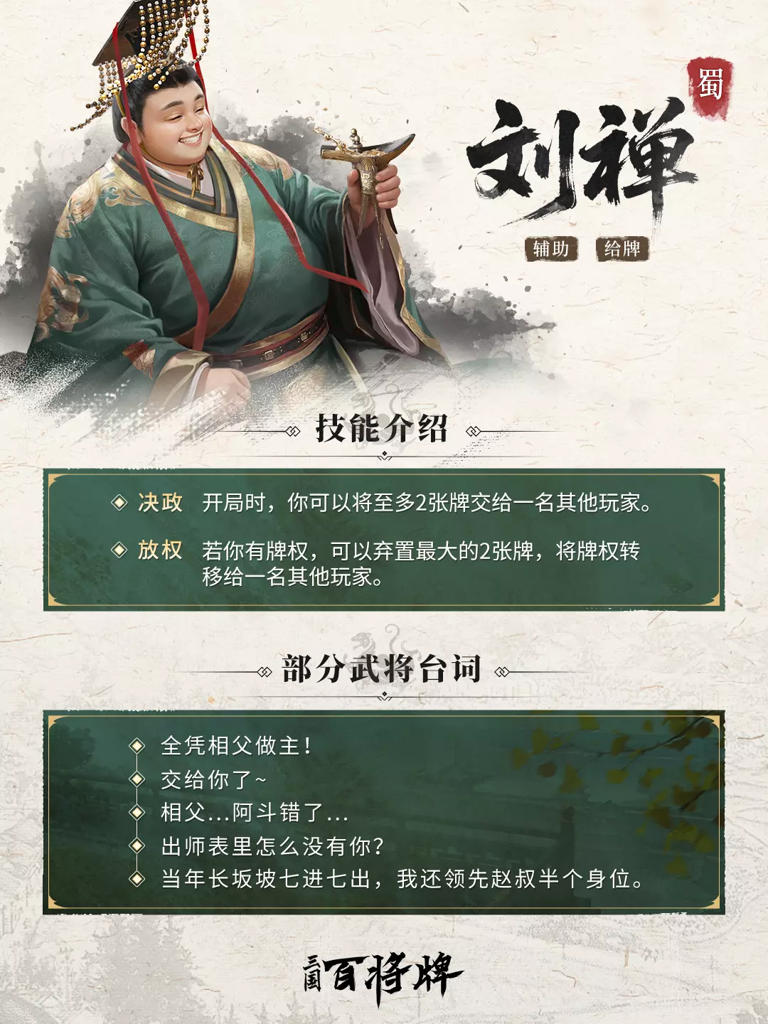【三国百将牌】武将介绍——刘禅 【三国百将牌】刘禅 特点:辅助、给牌 技能简介:在《三国:百将牌》中,刘禅是一位以辅助为核心的策略型武将。其核心玩法围绕“以牌换势”,开局阶段,刘禅可发动技能将至多2张牌交给一名其他玩家,奠定团队优势;当刘禅获得牌权时,可弃置自身最大的2张牌,将牌权转移给一名指定的其他玩家,化用其历史上“政事无巨细,咸决於亮”的管理方式,将个人资源转化为团队优势。 “当年长坂坡七进七出,我还领先赵叔半个身位。”实战技巧: 开局阶段,刘禅可发动【决政】技能,将手牌移交其他玩家: 移交给友方时,优先选择王牌、地主底牌中没有的单牌或对子,有概率协助队友组成炸弹和飞机; 面对郭嘉等依赖手牌计数的敌方时,在不影响自身出牌策略的情况下,可拆散小点数对子,移交一张单牌,扰乱敌方的出牌节奏,同时避免其凑出炸弹。 需要注意的是,若对友方或敌方的手牌没有确切把握,可不发动【决政】技能。 刘禅的核心技能为【放权】,敌方打出大牌后,刘禅可夺取牌权主导节奏;当自身手牌乏力时,则发动【放权】技能,将牌权转移给队友,确保节奏掌握在友方手中。【放权】技能还具备“终结”效果:当刘禅仅剩2张手牌时,发动技能弃牌可直接胜利;仅剩3张散牌且上家为友方时,发动技能弃置两张最大牌转移牌权给队友,队友打出小点数单牌,自己再将剩余的1张牌打出,即可获得胜利。 若刘禅在友方,需做好承接手牌与牌权的准备,灵活调整出牌策略; 若刘禅在敌方,需留存关键大牌压制,在刘禅发动【放权】技能时夺取牌权,避免出牌节奏始终在敌方手中。 刘禅善于把控出牌节奏,既打乱对手策略,又为队友补足手牌、传递主动权。看似辅助定位,实则通过精准把握技能时机,为团队创造1+1>2的战术增益,是极具策略深度的团队核心武将。※详细技能描述点击下图查看 ※开发中版本,实际以游戏内为准