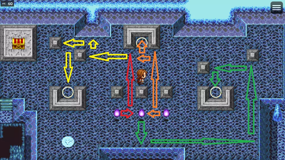 第五个谜题: 上层方块:左、上、右 右侧方块:左、上、左、下、左、上、右、下 上层方块:下、右、上、左、上、左、下、右 左侧方块:右、上、右、下、右 下一层:直接向上走并与巫师对话。 使用传送器离开。 封印之塔 2层物品:金钥匙 3层物品:生命粉末、金钥匙 5层物品:强效药剂 1层物品(浅绿色传送器):金钥匙 6层物品:天籁长笛(迷途者的饰品)、金钥匙 7层物品:金钥匙 8层物品:金钥匙 5层物品(深蓝色传送器):金钥匙 5层物品(红色传送器):疫病 注意:红色灵体只能被纯冰伤害!暗影只能被物理和中立属性攻击。贪婪之壶是随机遇敌!1层:只有浅蓝色传送器可以使用(通往2层) 到达5层并使用金钥匙。 从左上方或左下方的洞跳下可到达神之手。 从右上方的洞跳下可找到贪婪之壶。在它逃跑前击败它。会掉落600经验值、100金币和超级回复药。 从离门最近的洞跳下可获得一把金钥匙。 从上个洞向右数第一个洞跳下,拉动拉杆以激活浅绿色传送器。 到达6层。 踏上绿色传送器并保存,然后踏上顶部的箭头以获取精神之卷。 6层还有另一个贪婪之壶。 到达9层并使用金钥匙进入。击败宝箱怪以获得雷击板甲。 返回3层,踏上东侧的浅蓝色传送器。踩右侧箭头以抵达【雷神之锤】。接下来踩从右数第二个箭头,然后踩左侧箭头到达地板的另一侧。 踩第二个箭头以获取【折射药剂】。 现在小心走向唯一的箭头,抵达拉杆处并激活深蓝色传送器。 返回3层并使用深蓝色传送器。将方块推入孔洞中,然后跟着下去。 重复上一步骤。在2层将方块向右推、向上推、向左推再向上推,以获取【拉弥亚竖琴】。 使用6层的深蓝色传送器获取另一把【金钥匙】并抵达另一个【贪婪之壶】。 打开8层的两道门并乘坐深蓝色传送器。 转动箭头以便能抵达下一个拉杆。现在红色传送器已激活。 尽快使用它以获取【咆哮雷霆之帽】。返回并乘坐另一个红色传送门,找到最后一位宁芙娜拉,获取3把金钥匙。 回到2层,踏上红色传送门。再使用2把金钥匙,即可到达奥金矿石处。 使用1层的红色传送门,前往另一个贪婪之壶。 回到7层,持续踏上绿色传送门,直到抵达一扇门。 黄色水晶会为你恢复生命值,同时你将获得黄金精华。 乘坐1层的金色传送门,前往10层。 击败教徒。在到达顶层前使用花朵。 头目海德拉克斯:蓄力/强化+千拳连击是你获胜并获得1000经验值的保证。 你获得了【附魔入门指南】。 宁芙村:找到所有宁芙后,获取锻造锤。 乌洛的锻造铺:将锻造锤归还给他。你应该能够锻造出所有3件传奇武器并获得你的第一个成就。 森林迷宫 与女巫们交谈。 乌洛的锻造坊 向他展示附魔剑,如果你库存中有第10块奥金矿石,就能获得升华森林之刃和第二个成就。 强化与附魔森林之刃 - 已增强 西谷镇 与铁匠琼达尔交谈。 在旅馆休息。 从琼达尔处获得森林之刃。 进入你的船。东港岛 地图1物品:药水(木箱)、力量鱼、14金币(袋子)、迷雾药水、以太(木箱)、25金币(袋子) 地图2物品:忍者服、22金币(袋子)、强效药水(木箱)、幸运蛋、药水(木箱)、甜葡萄酒、全恢复药(木箱)、眼药水(木箱)、魔力浆果、生命粉末、活力浆果、奥术矿石、45金币(袋子) 掉落物:力量鱼(兽人首领)、护身符(流亡者)、幸运蛋(小偷) 巨型树物品:魔法蘑菇 小屋地图3物品:已上锁,需要钥匙才能获得锈蚀指节 注意【佐特之塔】的首领阿尔法,你在巨型树中100%会遇到他。 在白色帐篷休息以继续前进。之后你可以在那里免费休息(有闪光效果)。 击败首领阿尔法以获得乌诺的【无效毒素】饰品。东港岛秘密(第16个,或在新迷你指南中为第15个):迷雾药水(木箱)。你需要一把钥匙来打开门,以获取22金币(袋子)、77金币(袋子)、海盗藏匿物(将其用于露丝!)