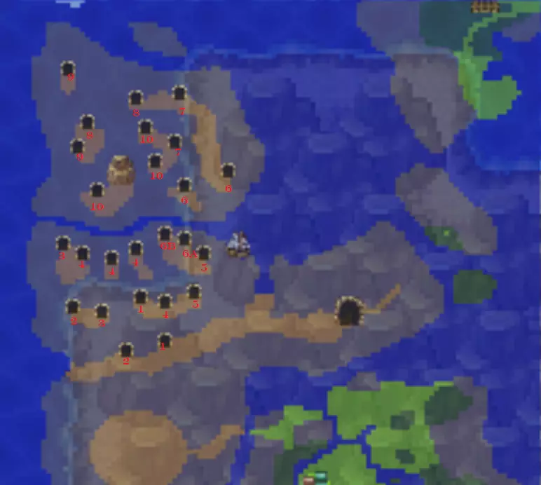 山顶湖 哈洛尼亚西南的小岛。 物品:迷雾药剂、露丝的“闪电”饰品 利安山脉 物品(地图1):滋补剂(木箱) 物品(地图3):药剂(木箱)、全恢复药剂(木箱) 物品(地图4-3):生命粉末、以太 物品(地图5):眼药水(木箱)、乌诺的“致盲药剂”饰品(路径终点) 物品(地图8):金色生命粉末 跟随教徒前往地图4的隐藏洞穴。洞穴另一端有另一个隐藏洞穴,内有2个宝藏。 利安山脉秘密(#8,新迷你指南#6):残余药剂、魔法浆果和腐化药剂