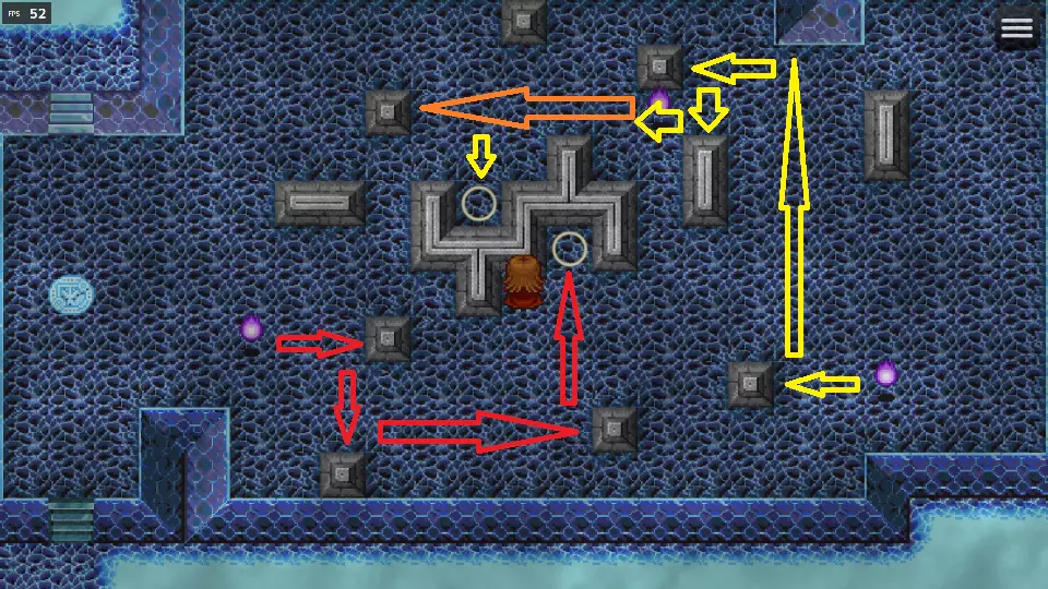 物品(地图4):干以太(木箱)、强效药水(木箱)、魔力戒指(拟态怪)、完全恢复药(木箱)、46金币(袋子)、生命粉末 谜题3位于东北方向,沿着向北的路径可找到 Boss(更南边有一朵花)。 解谜顺序为红、橙、黄,奖励在十字路口西南方向:格温的【多彩焦点】饰品。