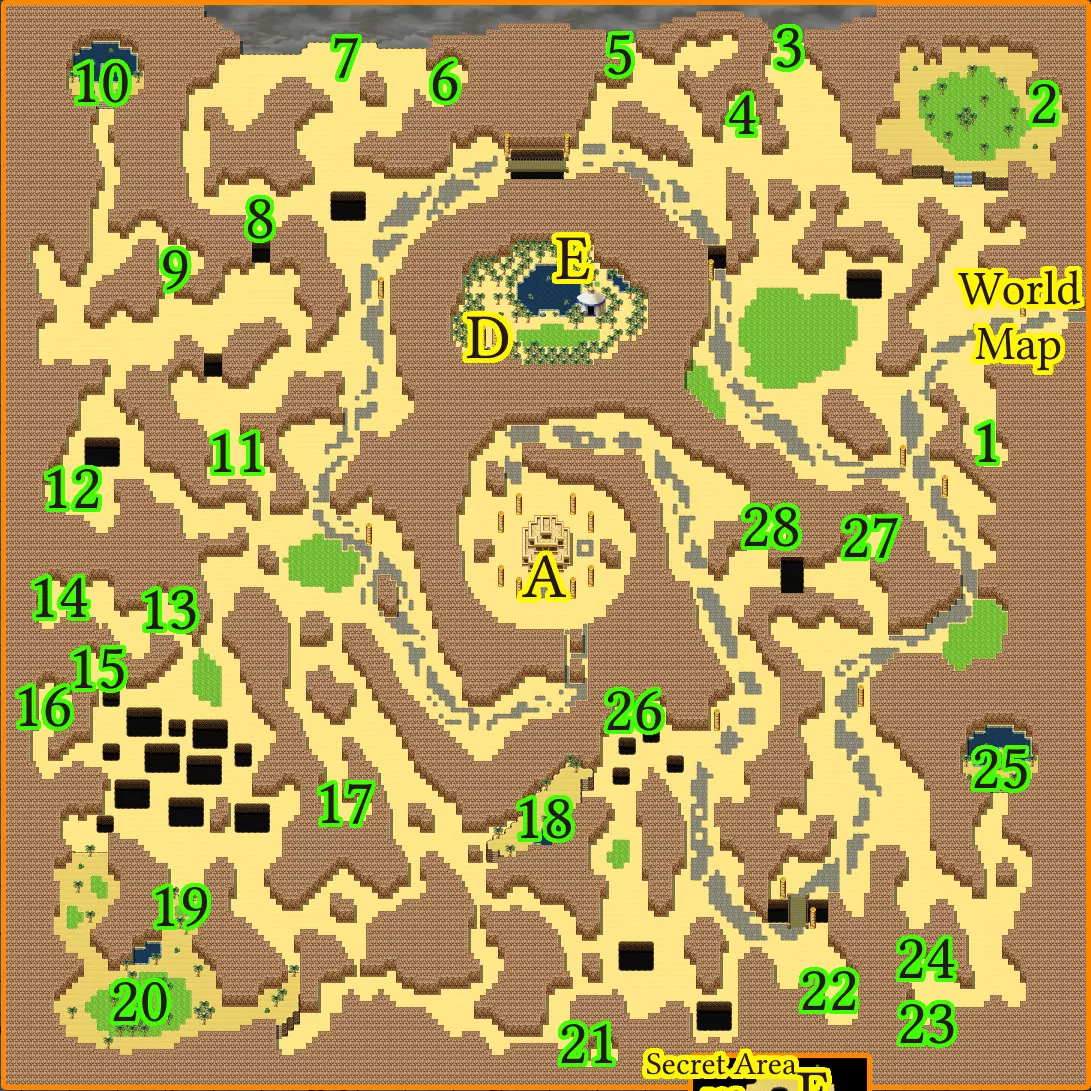物品:生命粉末x2,露丝的“复活”饰品,50金币(背包),全恢复药(箱子)x2,强效以太药(箱子)x3,强效治疗药(箱子)x3,奥金矿石,自由行动药水,36金币(背包),48金币(背包),33金币(背包),迷雾药水(箱子),格温的“牺牲”饰品,残余药水(箱子)x2,12金币(背包),爆破锤,幸运药水(箱子),23金币(背包),腐蚀药水(箱子),40金币(背包),45金币(背包) 不错的掉落物:力量鱼(沙漠 Gronn),泰坦腰带(Gronn 阿尔法) 推荐等级:困难模式25级。 骨头阿尔法在草地地格的遭遇率更高。 沿着街道可以到达神庙。 神庙旁边有一朵花和一个离开沙漠的传送器。物品(神殿):残余药水(木箱)、超级回复药(宝箱怪)、优雅长裙(宝箱怪)、80金币 当走到地图边缘时,可以直接上楼(前往下一朵花和 Boss 处)。 这些宝箱都是宝箱怪(内有力量护腕、幸运戒指、屏障戒指),所以把它们烧成脆片吧! Boss 守护者(有两只手):尽快击败双手以削弱它!当你瞄准魔像时,它会开始闪烁。弱点是冰系。每当整个魔像开始发光时,双手就会复活。 午夜沙漠秘密(#14,或在新迷你指南 #13 中):活力樱桃、火焰戒指、迷雾药水