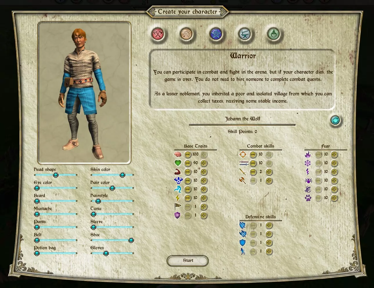 竞技场奖励:竞技场的货币收益。 敌人强度:竞技场以及我认为还有地下墓穴/远征中敌人的属性值。 库存:物品的容量上限,需要注意的是已装备的物品仍会占用总库存。 战斗人员与工匠:这些角色的出现数量。 薪资与维护费用:雇佣兵、工人的薪资以及基地的运营成本。 声望:通过竞技场获得声望,当声望达到100时游戏“获胜”。声望似乎还会影响竞技场敌人的强度,且声望越高,竞技场的货币奖励也会相应提升。 建造:基地内建造设施的成本。 物品售价:仅影响物品的出售价格,我将其设置为+60%。公会入门任务:默认情况下,在你培育出第一只杂交怪物后,会有一个任务限制你参加锦标赛和公会集市。我个人不喜欢这个设定,所以会关闭它。 杂交/纯血怪物战斗限制:开启时,你只能在地下墓穴使用纯血怪物,在竞技场只能使用杂交怪物。我个人希望所有怪物都能在任何地方战斗。 器官腐烂:开启时,器官每回合腐烂10%。我更倾向于不处理这个设定,因为这需要管理更多怪物,让它们存活到你准备好移植它们的器官为止。 除此之外,你可以选择旗帜的设计和家族的名称。 然后你可以选择地区。每种选择的优缺点都已清晰列出,但有一点需要考虑的是气候因素,因为不同的怪物对温度和湿度有不同的舒适范围。你也可以通过注入血液来改变这一点(食肉怪物的适应范围最广,而食肉怪物的血液能提供最广泛的耐受范围),不过目前你只需根据想要培育的怪物类型来考虑气候因素,尽管从培育食肉怪物开始总是最稳妥的选择。 我认为不同区域也有一些专门的怪物巢穴探险活动,这些活动是获取大量免费怪物蛋或幼崽的途径,同时还能击杀一些怪物并获取它们的肉。我认为特定区域的猎人遇到某些怪物的概率会更高,但最终所有怪物都会在各个区域出现,尤其是公会集市通常也会带来稀有怪物。 个人而言,我通常会选择气候最温和的区域(默认区域),不过这取决于个人偏好。 选择角色 在这里你需要做出一个重要决定,是选择战斗型角色还是 crafting 型角色,然后再确定具体是哪一种。 战斗型 vs crafting 型 选择战斗型角色,你有机会从一开始就打造一个强大的角色,其属性是你通过招募或训练永远无法获得的。此外,他们的初始年龄接近理想值(18岁,不过16岁是最佳年龄),因此基础属性的最终年龄衰减(我记得是40岁)会来得最晚。不过如果你使用它们且它们在战斗中死亡,那游戏就结束了,这一点需要注意。 制作的意思就是你从一名工匠开始,说实话这并不是很理想。这是因为制作需要投入装备和资源,而这些都需要金钱和时间才能发挥作用,即便如此,炼金始终有用,而锻造只是一次性的,之后装备就固定了。 战斗 战士 加成:每天获得少量津贴(默认情况下我记得是400)。初期有帮助,后期不明显。但如果金钱奖励设置得比较有利,就没什么用了。 弓箭手 加成:会时不时获得随机的蛋、幼崽以及肉。而且真的是随机的。我个人不太喜欢这个,因为我通常专注于三种怪物类型中的一种,而且在任何时候我都有特定需要培育的品种。此外,它的效果不太稳定,如果能像战士每次都能获得金钱那样有保障的话,可能会更好。 术士 加成效果:对所有品种的驯服有加成,比如对所有生物的驯服值+5或+10。这非常有用,尤其是在饲养爬行动物或昆虫时。食肉动物默认大多是可驯服的,不过也有一些会从中受益(而且我认为术士的加成能自动让所有食肉动物的驯服值超过阈值)。但它真正的优势在于,凭借这个加成再加上一个驯服符文,默认情况下几乎所有爬行动物和昆虫都能被驯服。那些尚未成年的怪物只需将其成长期延长1个单位(成长期为3的怪物将变为4),它们也能达到成年状态。 此外,还会配备一个血液注入工具以及每种怪物类型的一瓶初始血液。 这是我个人的最佳选择。 制作系统 铁匠 额外奖励:初始拥有一座铁熔炉,这是一件可在年度武器节购买的物品。非常需要常规金属/水晶,与弓箭手/炼金术士类似,以便做出更好的选择。 炼金术士 额外奖励:初始拥有一些炼金设备(能提升单个药剂的效果,同样可在年度草药节购买)。会随机获得可用于制作药剂的草药。也存在与弓箭手相同的问题,不够稳定,但如果每次都能获得的话会更好。打造战斗角色 对于这一点,我倾向于将智力值提升到100,这方面没有任何妥协。智力值决定了其他所有属性的成长速率,所以我更愿意将其最大化(而且目前游戏内还无法提升智力值)。 接下来,我会将生命值设定为95,你也可以考虑设为90,但生命值上限为100,并且你可以通过提升力量值来增加生命值。由于无论如何你都会获得一些生命值点数,我认为按照大约2点力量对应1点生命值的比例,你可以将初始生命值设定得略低于100。不过,这也取决于你计划提升多少力量值,例如你也可以将其设为85或80。此外,有一个天赋可以使生命值+1/2/3/4,但我宁愿不花费这个天赋点。 暴击率和反击率我都设为10,也就是最大值。两者都可以通过天赋提升,至于暴击,我最终会用天赋点将其提升到20左右(顺便说一下,每次暴击造成1.5倍伤害),但我会把反击保持在10点,因为这可能已经足够了,除非是那种在一回合内被多个敌人多次攻击的坦克型战士。 我把所有角色的恐惧值都降到最低,即10点。恐惧在这款游戏中对你来说是个大问题,或者说是对抗敌人的武器,我宁愿在早期就(大部分)把它