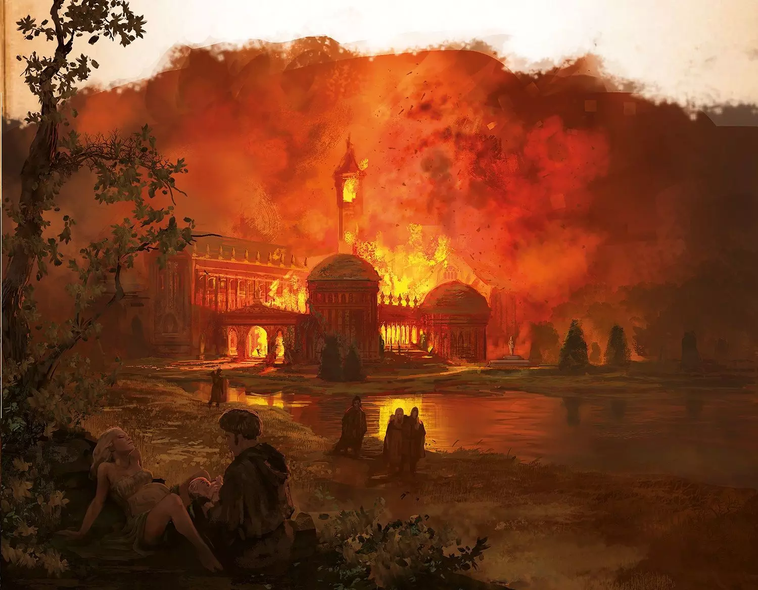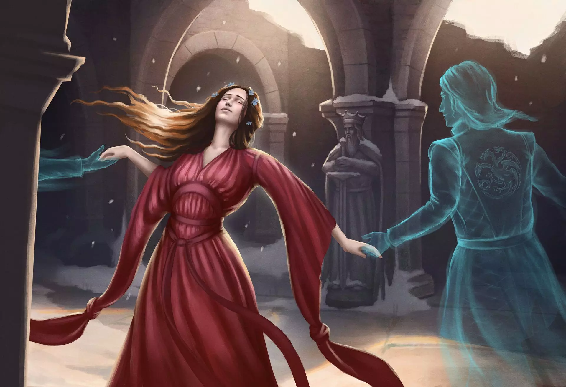 雷加的出生与盛夏厅的悲剧 火灾的原因至今不明,但人们认为这与伊耿国王想将龙重新带回七国的愿望有关。这位国王在其统治的最后几年里,一直在寻找瓦雷利亚驯龙术的古老知识,甚至为了找到维斯特洛大陆上尚未有人知晓的关于龙的文献和信息,组织了远赴亚夏的旅程。 石堂镇的珍妮在那空寂的国王大殿之上 珍妮与她的幽魂共舞 那些她失去的,那些她寻回的 还有那些最爱她的魂灵 那些早已远去的魂灵 她已记不起他们的名字 他们与她在潮湿的旧石地上旋转 转走了她所有的悲伤与痛苦 她从未想过离开,从未想过离开 从未想过离开,从未想过离开 他们从白日舞到黑夜 穿过席卷大殿的风雪 从寒冬到盛夏,又回到寒冬 直到宫墙崩塌坠落 她从未想过离开,从未想过离开 从未想过离开,从未想过离开 她从未想过离开,从未想过离开 从未想过离开,从未想过离开