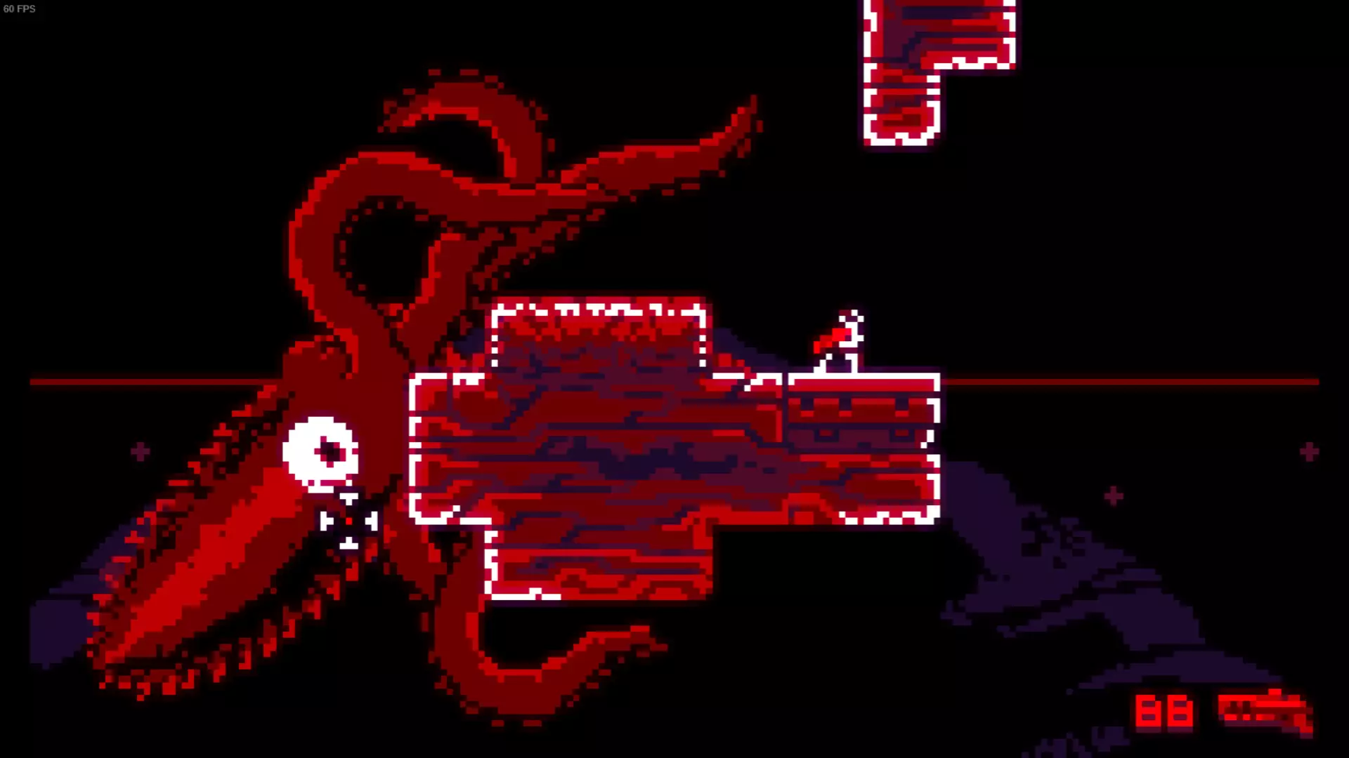 第一阶段:触手挥舞 第二阶段:迅速俯身冲向你的躯干。 地图右下角的 Boss 是独眼巨怪克拉肯。只有她的“躯干”可以受到伤害,大致在眼睛及以上的位置。“躯干”和触手末端都能造成致命伤害,由于其触手难以预测的挥舞,这个 Boss 可以说是最难(或者说最令人讨厌)的。