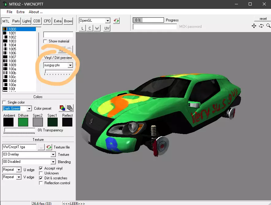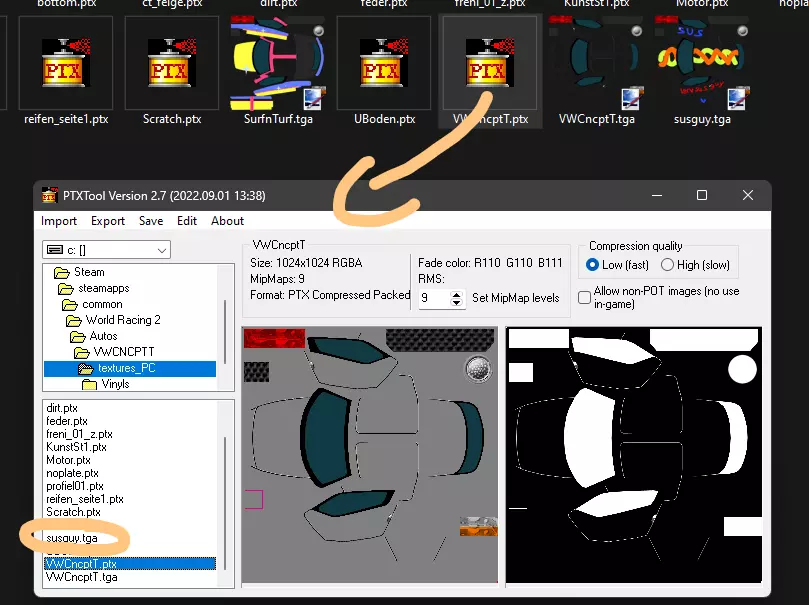 16.未压缩文件也可使用,但因其体积较大而较为不便。压缩过程中会产生压缩失真,但在我看来并不十分明显。 17.(可选步骤)若不想启动游戏即可查看效果,可在mtkit(材质工具包)中通过乙烯基滑块选择乙烯基进行查看。 对于《世界赛车2》1.4.3版本,还可将其制作成附加组件,方法是将文件放入Addons Vinyls Nameofyourvinyl Nameofthecarsfolder.ptx路径中。例如,在这种情况下,路径为Addons Vinyls Susguy VWCNCPTT.ptx。