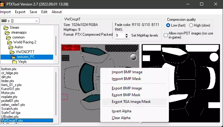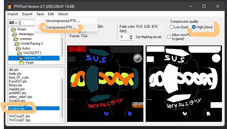 15.点击yourfile.tga文件,将压缩质量设置为高(慢速),并将文件另存为压缩的ptx格式。