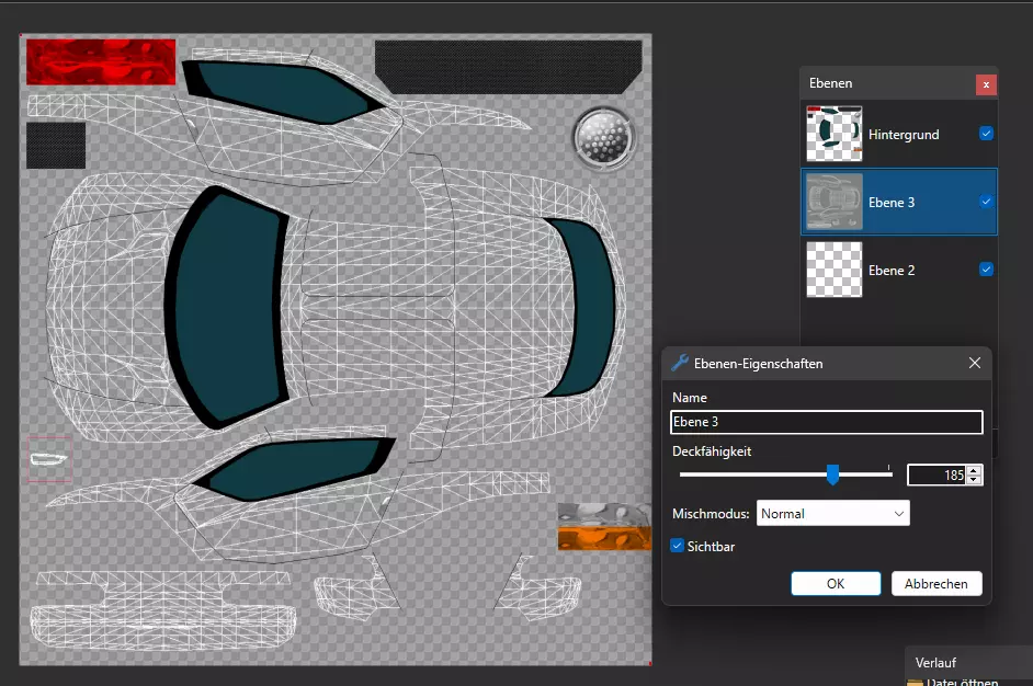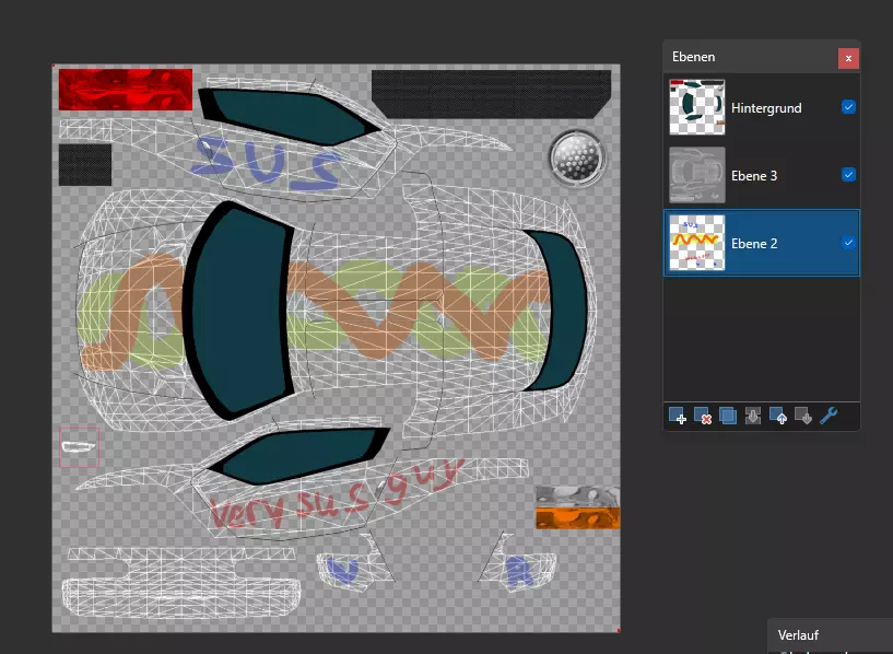 8.也可以通过将模型导出为lwo格式,并借助像Blender这样的3D软件获取UV贴图来实现,但这里不便详细解释。 9.为充分利用游戏车身纹理的透明特性,在原始纹理下方添加一个新图层。
