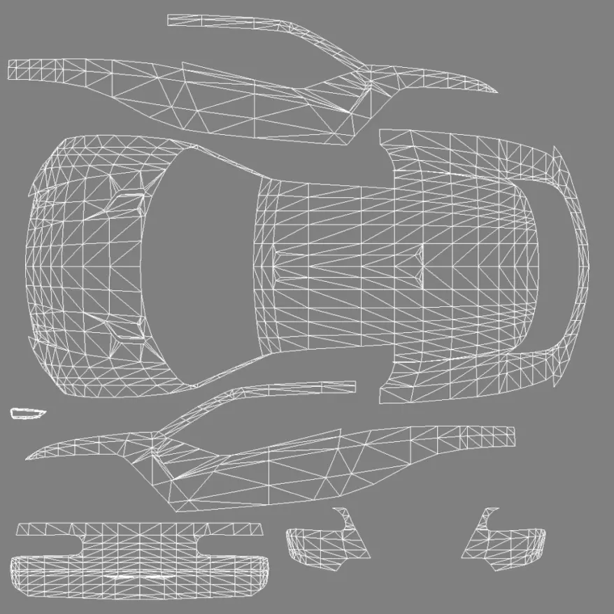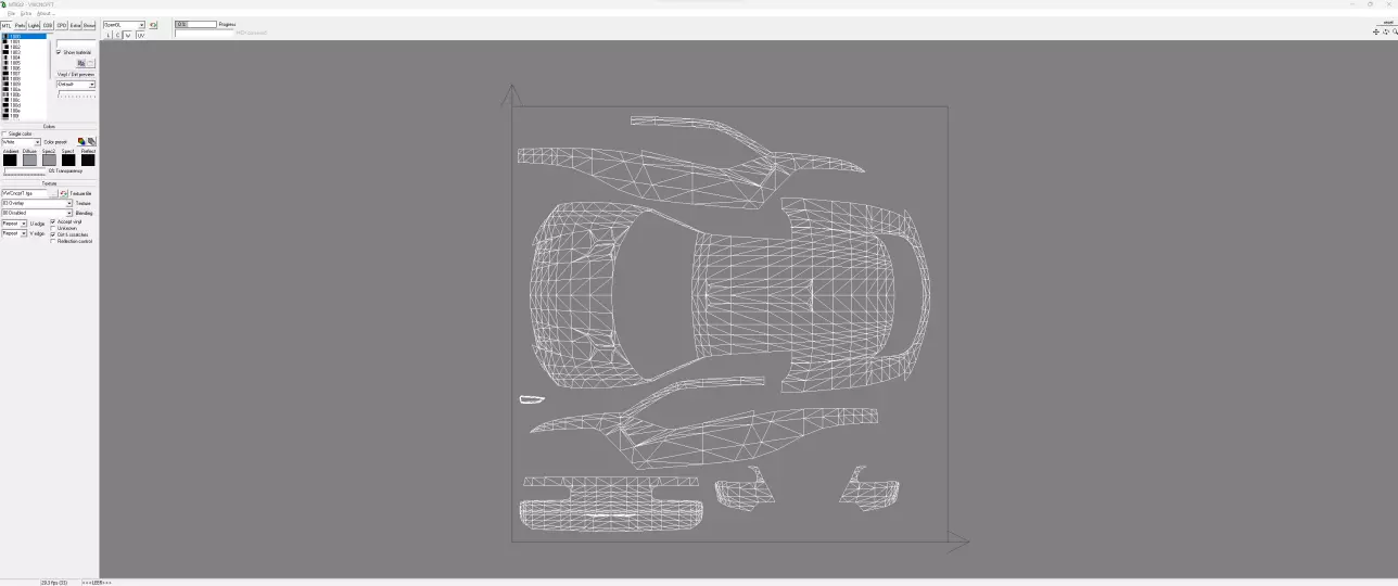 5.你最终要得到类似上面截图的效果。棋盘格代表透明区域。 6.(可选步骤)在mtkit中打开模型,仅显示车身材质,激活W和UV按钮,截取你能达到的最高分辨率截图,在图像软件中打开并将方框内部缩放至1024x1024。