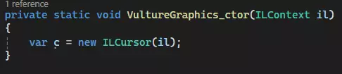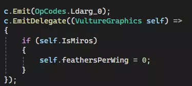c.Emit(OpCodes.Ldarg_0);将Ldarg.0插入到我们的堆栈中。和之前一样,这就等同于“this”(双关语)。 c.EmitDelegateNow这就是我们的秘密武器。c.EmitDelegate允许你调用一个匿名函数。这对我们意味着,我们只需将VultureGraphics加载到堆栈上,然后像对待任何普通函数一样对其进行操作。原本需要多条指令和一个分支的操作现在简化为两步。 整合所有内容