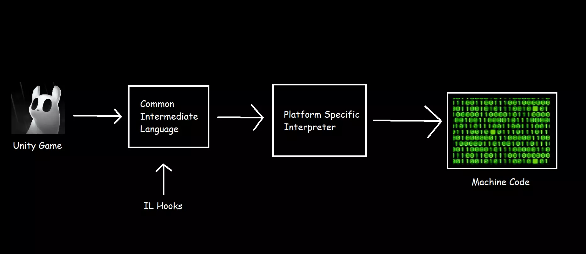 但如果我们需要更改代码本身中的某些内容,而在其前后运行代码都无法解决问题时该怎么办?这就是中间语言钩子(IL Hooks)的用武之地。本指南将尽力简化中间语言钩子的概念,让新的模组制作者不再对其感到畏惧。 你应该具备一些模组制作和编程的基础知识,但也不必过于担心,即使你对此一无所知,也可以尝试一下,说不定会有惊喜。 首先,让我们来了解它的实际作用。 什么是通用中间语言 中间语言钩子通过直接修改已编译的通用中间语言(简称CIL)来工作。 C#应用程序的工作方式是,它们首先被编译成CIL语言。这种语言是代码的简化版本,读起来有点像汇编语言,由特定平台的解释器将其转换为兼容的机器码。这为开发者提供了一个巨大优势,他们只需编写一次代码,就能在任何平台上运行(当然还需要一些调试)。 以下是一个简化图表