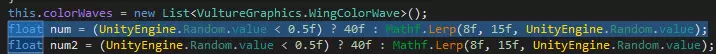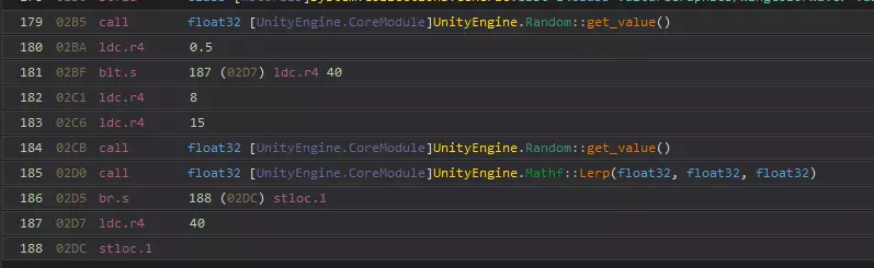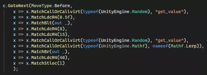 匹配本质上就是像搜索指令一样重写指令。通常,你应该匹配DNSpy高亮显示的所有内容,以防止冲突并保持堆栈平衡。如果要匹配的代码出现多次,可以匹配代码周围的其他内容,或者重新运行Goto函数,直到确定位于正确的代码处。慢慢来,确保理解每个操作数的作用。 匹配模式 通常我们有4组匹配。 参数:单个数字/值 类型:仅对象类型 变量/调用:类型+全名 分支:输出标签 让我们按每组逐步讲解。 MoveType.Before 我们希望在匹配到的所有内容之前插入代码。 MatchCallOrCallvirt 这是一个调用,因此它需要一个类型和一个名称。对于第一个,我们使用UnityEngine.Random类型,由于我们要获取一个属性,所以按照IL指令中的写法调用“get_value”。 MatchLdcR4/MatchStloc这些是我们的参数,它们只需获取IL指令中的任意数字,一点也不复杂。 MatchBlt/MatchBr我们的分支更容易编写,因为你可以直接忽略输出。 最后是那些没有显示出来的类型,你只需像处理调用时那样使用该类型,只是不需要名称。一步步完成所有步骤,你就能得到最终结果。