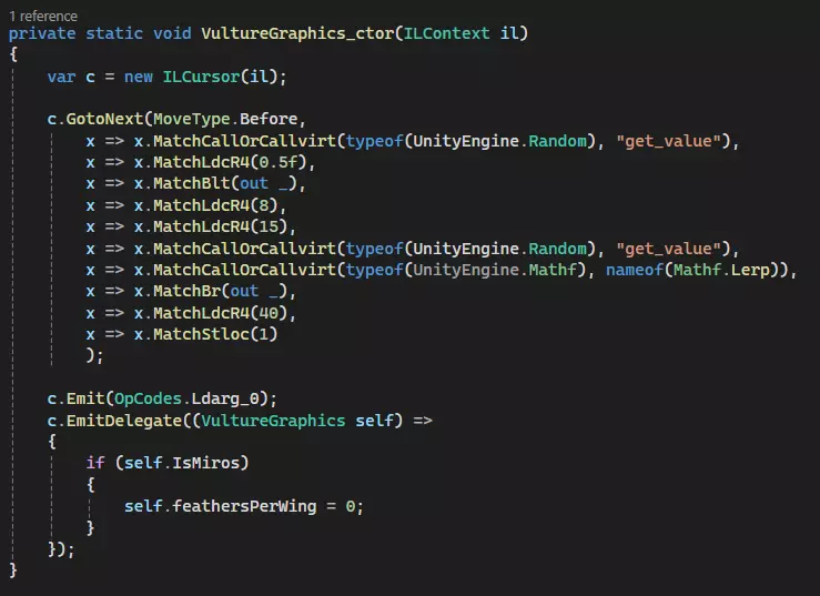 首先你会看到操作码(OpCodes)和操作数(Operands)。操作码告知编译器要执行何种操作,操作数则在需要时告知如何执行该操作。并非所有操作码都需要操作数。索引是指令从0开始执行的顺序。 操作码解释 Ldarg.0:我们首先看到的是Ldarg.0,它将第一个参数加载到栈上。Ldarg.0相当于“this”,是你最常使用的操作码。C#中所有非静态函数都以这种方式工作。 Ldarg.1:将第二个参数加载到栈上,也就是我们函数接收的布尔值。除了其类型无关紧要、编号方式相同外,没有太多其他需要说明的。 call:call的作用就是调用一个函数。在匹配函数时,你会经常用到这个,但在插入自己的代码时会使用其他方法,这能让流程变得简单很多。 ret:完成后返回函数。由于此函数没有返回值,所以不会返回任何内容,但如果有的话,在返回前栈上需要有一个有效的返回变量。 你将使用的最常见操作码:其中许多是不言自明的。 Ldarg:索引0在函数为非静态时表示this,否则表示第一个参数。末尾的数字对应参数的序号。 Ldloc:将局部变量加载到栈上。格式与Ldarg相同。 Ldfld:将类中的字段加载到栈上。 BrTrue / BrFalse:如果为真则分支或如果为假则分支。 call/callvirt:调用函数。 ret:返回…… 现在让我们尝试自己编写一个。 我该如何编写它们。让我们拔掉所有米洛斯秃鹫的羽毛。要实现这一点,我们需要挂钩VultureGraphics构造函数,并在它有机会生成翅膀之前将feathersPerWing设置为零。首先创建你的IL钩子。